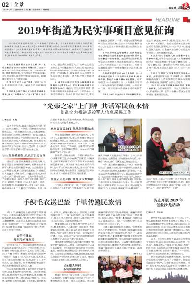 □通讯员 吴鑫 近3个多月来,在宝山社区优抚对象、军人们的朋友圈里,一条热门信息受到大家的持续关注。“政府要为我们军人采集信息啦!还要给我们挂光荣之家牌呢!”没错,这就是宝山路街道优抚工作近期发生的大事。为体现党和政府对军人群体的关爱,传承拥军优属光荣传统,街道正紧锣密鼓地按照市、区下发的相关工作方案,结合社区实际,全力做好这项军人朋友们期待已久的实事工作。 认认真真摸底数,扎扎实实定方案 退役军人信息采集是落实政府决策,弘扬军民鱼水亲情的时代精神,营造全社会尊崇军人职业氛围的重要举措。宝山路街道在工作开展初期,精心部署稳扎稳打,针对辖区军人数量多、采集核对工作量大的难点,组织工作人员开展专题培训,在每个居委会设立了信息采集点,由专人进行信息采集、核对、汇总,前期上门填报1000余份信息。目前,街道共整理、排摸辖区军人信息1900多条,将组织专业社工力量进行详细核对、上报,切实做到审查、核实信息准确无误,确保在规定时间节点完成此项重要工作。 欢欢喜喜送上门,热热闹闹挂起来 从军报国得尊崇,解甲返乡受荣光。2月19日,正值元宵佳节,宝山路街道办事处主任胡建文带队,上门为伤残军人马叔叔、病故属马阿姨等优抚家庭举行“光荣之家”门牌悬挂仪式,并送上节日鲜花。庄重而热烈的现场洋溢着一张张温暖的笑脸,金灿灿的门牌照亮了军人们的心坎。 伤残军人马叔叔谈到,年轻时候当兵一心想着保家卫国,内心充满了自豪感。时隔多年,党和政府没有忘记他们,在社区生活中时刻关爱着他们,还为他们挂上亮堂堂的光荣牌。这对军人们来说意义很大,是对他们奉献的肯定和尊重。马叔叔表示,他要继续发挥余热,和家人一起做社区的优秀志愿者。 堂堂正正亮身份,红红火火敬功臣 “找到人,送到家,贴上墙。”目前,街道正分批启动“光荣之家”门牌悬挂工作,针对街道人户分离人员较多的实际情况,工作人员将因地制宜、克服困难,想方设法做好此项工作,确保“光荣之家”门牌发放工作落实到位。 今年,宝山路街道优抚工作将以“双拥模范城区”创建为契机,进一步提升优抚服务水平,为功臣们提供更加温暖贴心的服务。一是在社区事务受理服务中心、社区生活服务中心、社区综合为老服务中心开设“军人、优抚对象优先”窗口,营造良好的拥军优属社区氛围;二是以社区生活服务中心为平台,进一步梳理整合优抚服务项目,以热点、难点、痛点问题为突破口,为优抚对象提供更加切合需求的“一站式”服务;三是以“红帆船”项目为支撑,突出“双拥(优抚)之家”的载体作用,在开展优抚对象自治与互助服务,推动“双拥(优抚)之家”从“一间房”转变为“一个家”。