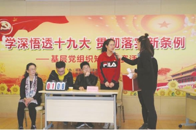为深入贯彻落实《中国共产党支部工作条例(试行)》,3月20日下午,由半淞园路街道党工委主办,街道党建办及社区党建服务中心协办的“学深悟透十九大 贯彻落实新条例”为主题的基层党组织知识竞赛在街道六楼会议室举行。来自基层党组织的20支代表队共60名选手参加本次竞赛。街道党工委副书记胡向明、街道党建办公室主任黄鹏翔、街道两新党建负责人韩鑫出席此次活动。 街道党工委副书记胡向明表示,此次知识竞赛活动的举办很有意义,能够让大家进一步提升对《条例》的认识和理解,夯实党建工作基础,并预祝各位参赛队员在比赛中赛出好成绩。 竞赛现场精彩纷呈,高潮迭起,内容围绕《中国共产党支部工作条例(试行)》开展。本次竞赛设置必答题及抢答环节,随机抽取题目进行作答。现场气氛活跃而紧张,各代表队参赛选手使出浑身解数,不甘示弱,分秒必争,积极应答,充分展现队员丰富的知识积累。 经过激烈角逐,上海世博城市最佳实践区商务有限公司获得了竞赛第一名,中国船舶工业集团708所、上海黄浦区科技创业中心、上海永利工业制带有限公司获得了第二名,南京证券股份有限公司上海分公司、中船重工第702研究所上海分部、上海恒量医学交流服务中心、半淞园路街道入党积极分子队、半淞园路街道党建指导员队获得了第三名。 此次活动,集知识性、教育性、趣味性于一体,形成了“以赛促学、以学促做、融会贯通”的良好学习氛围,使广大党员全面掌握《条例》内容,切实增强贯彻执行《条例》的思想自觉和行动自觉,为扎实推进党支部建设标准化工作、不断夯实党建工作基础发挥了重要的促进作用。