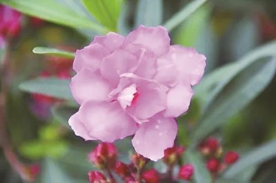 温馨提示:夹竹桃花期以夏秋为盛花朵繁茂,颜色艳丽且有毒性,仅供观赏,市民朋友切记不要随意采摘。