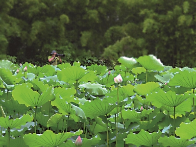 入夏之后,赏荷成了大家都很期待的一件事。长风公园的荷花日前也已经陆续开放,由于最近雨水特别充沛,今年的荷叶荷花十分繁茂。1000平方米的荷花池中,荷叶展示了绿色的“时装”,朵朵荷花也已经开始吐露芬芳,叶似翡翠般碧绿晶莹,花如白玉般纯洁无暇。三两游客早已在岸边架好“长枪短炮”,准备记录下这番美景。