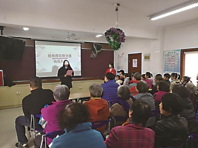 3月13日下午,桂杨园居委会召开了垃圾分类动员大会。桂杨园党总支、居委会、曹杨物业、申安物业、辖区单位久龄家园为老服务站、杏山路幼儿园桂杨园分园、农工商超市桂杨园店、百姓大药房以及社区楼组长、志愿者六十多人参与了此次活动。曹杨新村街道绿化和市容管理所所长江冬、副所长张永民一行到现场指导相关工作。 杏山路幼儿园老师带着可爱的孩子们为大家表演了儿歌《环保行为开始了》和《垃圾分类好处多》,拉开了本次活动的序幕。接着上海菁美环境科技有限公司李欢老师带来了一节精彩的垃圾分类宣讲课,当李老师用图像说明,上海一天的垃圾量相当于4000头大象时,现场一片啧啧声,大家有了更加直观的感受。 曹杨新村街道绿化和市容管理所所长江冬也上台同居民们热情沟通。从硬件建设和软件建设两方面为大家描绘了一幅美好的愿景。经过了讲课环节后,绿化和市容管理所的同志们拿出了考题,现场考考大家听课的效果,大家踊跃回答,有问必答,有答必对。 此外,现场桂杨园区域内各家单位发出倡议,积极做好垃圾分类、自觉维护周边环境。桂杨园居委会主任陆炜、曹杨物业鲁经理、申安物业丁经理、久龄家园查老师、农工商超市韩经理、杏山路幼儿园师生代表、百姓药房代表一一上台,共同签署了《桂杨园同区域企业垃圾分类倡议书》。 在会上还成立了桂杨园垃圾分类党的工作小组,发挥党员模范带头作用,引领群众全面开展垃圾分类工作。
