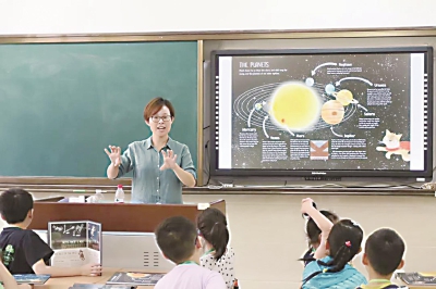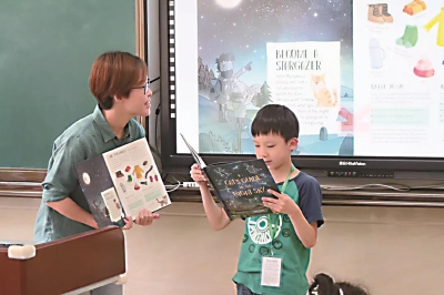 “小朋友们,你知道第一只登上太空的狗是哪个国家的?曾经瘦弱的流浪猫咪,为什么能够登上太空?……”教学经验丰富的王卓娅老师在开始阅读绘本前,用各种有趣的小问题引发孩子们的好奇心,缓缓铺垫,引出今天的《A Cat's Gu ide to the Night Sky》一书,跟随小猫咪的眼睛,小朋友一起发现宇宙,成为看星星的人。