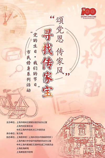 为庆祝中国共产党成立100周年,建设新时代的家风文化,市民修身系列活动正面向在沪生活、学习、工作的各类家庭,征集承载一代人精神或一个时代良好家风的“传家宝”,征集自即日起开始至5月下旬结束,欢迎全市广大家庭积极参加活动。 征集时间 即日起至2021年5月下旬征集对象 在沪生活、学习、工作的各类家庭 作品要求 一、作品内容 1.反映家庭成员对中国共产党的百年光辉历程和伟大业绩的深厚情感; 2.反映家庭成员(特别是父辈、祖辈)在建党百年历史中的动人瞬间; 3.反映家庭成员在党的领导下越来越美好的生活图景; 4.反映家庭成员参与建设社会主义现代化国际大都市,见证上海日新月异发展的切身感受。 二、作品形式1.视频类 (1)标题:例如我家有个传家宝+原创标题。 (2)格式:2分钟以内,MP4等格式,1GB以内文件。 (3)视频自述模板:传家宝是什么、什么来历、有何故事,以及对自家的意义和影响,并附上一句庆祝中国共产党成立100周年的祝福语。 (4)简要介绍:字数200-500字左右(含报送家庭的联系方式)。建议同时提供相关传家宝的照片,大小1M以上,照片不超过9张。 2.文字照片类 若无法录制视频或报送的,可寄送文字或照片线索(含报送家庭的联系方式)。应征途径 1.视频及简要介绍发送至邮箱wmb2021@163.com 2.若无法直接以视频形式报送,可将文字或照片线索,邮寄至“徐汇区高安路25号活动指导处收”,邮编:200031。注意事项 1.报送内容须符合本通知要求,特别要注明报送家庭的联系方式,必须为原创作品,不得转载、剽窃、抄袭他人作品。 2.报送内容不得侵犯第三人的包括著作权、肖像权、名誉权、隐私权等在内的合法权益。 3.报送内容版权归主办方所有,主办方有权对报送内容编辑修改、公开发表、结集出版、播出推送、展览展示等。 4.主办方将结合全市庆祝中国共产党成立100周年有关活动、市民修身系列活动、家庭文化节活动等,对优秀的报送内容进行宣传展示。