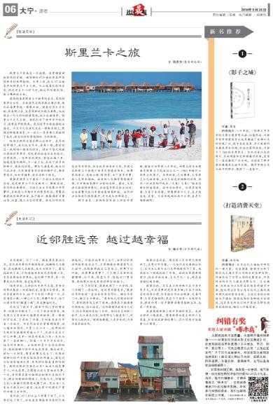 文 邵贵方(慧芝湖花园) 斯里兰卡是南亚一个岛国,这里拥有神秘莫测的古城、绚丽缤纷的沙滩还有各种各样神奇的热带植物。今年三月,我与27名旅友参加斯里兰卡8日游,从上海浦东机场出发,经过近8个小时飞行,抵达科伦坡机场,踏上那神秘土地。 高跷钓鱼是斯里兰卡独有的名片。高跷钓鱼源自古时,当地渔民没钱买船出海打鱼,他们在海里竖起一根根木桩,捕鱼时涉水至木桩,然后爬上去,坐在简陋的木桩上垂钓。远远望去一行人好似踩着高跷,站立在海洋中。斯里兰卡天气炎热,渔民们为了避开中午的烈日,通常在早晚钓鱼。我们趁早兴致勃勃赶往海边,只见十几位渔民坐在一根根木桩上,聚精会神握着渔竿,不一会儿一条条鱼儿就被钓了起来,旅友们纷纷拿起相机、手机抢拍。 哈勃亚纳村坐落在群山众林中,在导游的带领下,我们先坐牛车,再乘小船,最后经过一段崎岖小路来到村庄。村庄只有几间破旧简陋的茅草房,村民看到远道而来的我们,非常热情,一位年长的村民,拿起采摘工具,钻进茂密的树林,不一会工夫,采来了许多新鲜椰子,请我们品尝。那天气温甚高,旅友们汗流浃背,大家喝着清凉甘甜的椰子水,都非常高兴,纷纷将糖果、糕点送给小朋友。 康提是斯里兰卡最后一个独立王国的所在地,也是斯里兰卡的宗教中心、佛教圣地。我们到达康提时,正碰上发生多起暴力冲突事件,当地进入为期十天的紧急状态。军警在康提地区维护治安,各个路口、要塞都有军警站岗、检查,晚上还实行宵禁。旅友们听到消息后有些紧张,但当地导游告诉大家,中国已在斯里兰卡援建了许多大型建设项目,如集装箱港口、高速公路、医院等,办了许多实事,给人民带来福祉,政府和人民都非常感谢中国,对中国游客都十分亲切友好。最后,大家决定旅游照常进行。在游览参观名胜古迹时,当地军警为我们中国游客保驾护航,站岗的士兵和我们热情握手,并与我们合影留念。 狮子岩是一座构筑在巨岩上的空中宫殿,被誉为世界第八大奇迹。峭壁上的美女壁画是斯里兰卡民俗标志之一,1982年被列入世界文化遗产。参观结束,已近黄昏,大家乘上大巴回宾馆,正当大家迷迷糊糊的时候,忽然一位游客惊叫起来:“大象!大象!”旅友们顿时情绪高涨,招呼司机停车。征得导游同意,大家下车观看。野象群有十几头,在互相追逐、觅食。大家举起相机拍个不停,真是大饱眼福啊!
