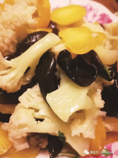 嗨,大家好!我叫榕妈,是住在联洋新社区的一位全职妈妈。对于妈妈们来说,如何抓住家人的胃是个很重要的课题,我虽然不是科班出身,但也算对各美食小有研究。 花椰菜是大家常吃的菜,属于十字花科,除了味道鲜美、营养价值高之外,还有很高的药用价值,不仅富含维生素C,而且还具有抗癌功效。不管是减肥瘦身,还是强体健身,都是不可多得的食材。 主料:花菜、木耳、胡萝卜辅料:糖、盐、油制作过程: 1、花菜洗净掰小块,木耳泡发洗净,胡萝卜去皮洗净切片; 2、水中放少许油,将花菜焯至八分熟; 3、热锅冷油,先下胡萝卜翻炒至稍软,再下木耳翻炒一分钟; 4、加入花菜,再加少许水炖煮三分钟左右,最后加适量糖、盐调味即可。 如果你也是吃货、你也钟情于摆弄美食,就拿起手机扫描下方二维码关注“联洋妈妈俱乐部”的公众微信,与我们一起分享你的美食经吧。(关注微信后,回复“姓名+电话”,24小时内会有客服人员与您联系。