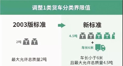 交通运输部发布《收费公路车辆通行费车型分类》行业标准的公告,要求按车(轴)型收取通行费,并且新的车型划分标准已正式发布,即将进入施行阶段! 新标准还一个细节,那就是实施日期由预计的2020年1月1日,提前到了2019年11月1日,足见新标准实施的迫切性。 与2003版标准相比,新标准主要做了以下几个方面的修订: 一、不再按额定载重量来划分 大吨小标失宠 2003老版标准中,货车按照核定的额定载质量进行车型分类,比如准载2吨及以下为一类车型,准载2-5吨为二类车型。老版标准导致当年许多地方出现“大吨小标”的现象,部分车主在买到新车后,想方设法都要弄一个低载重吨位的驾驶证,以便于节约通行费。而新标准中各类货车均按照总轴数、车长和允许总质量进行车型分类。两种方法的叠加,让驾驶证准载吨位的“大吨小标”再无用武之地。 二、核心重点 新标准将怎样划分货车车型 从公告来看,新标准不再是单一的准载吨位,而是将轴数列为一指标,把总重和整车长度列为二指标,多种指标相叠加的车型划分方式。 三、一指标:以轴数来划分货车车型 以轴数为划分的依据来区分货车车型,从目前得到的信息来看,大致分为二轴、三轴、四轴、五轴以及六轴和六轴以上,这就与2003版的1-5类五种车型的划分阶梯设计非常的类似。 四、二指标:车长和允许总质量 与老版标准相比,这里有个重要的变化,就是不再按驾驶证上的准载吨位,而是直接按驾驶证上的车货总重。在高速入站时进行计重,避免超载超限车辆进入高速公路。如果心细的朋友可以发现,早在多年前公安车管部门早就有了规定,在车门或车身上增加喷上了“总质量XXXX千克”等标识,这可能就是为了将来以总重量为核定标准而打下的基础。 五、4.2米蓝牌轻卡成为1、2类车型的分界标 新的车型划分标准中,将1类和2类货车分类界限值,确定为车长小于6米且允许总质量4.5吨。眼尖的朋友可能会发现,这不是前几天争议很大的4.2米蓝牌轻卡吗?按新标准的分类值来看,这种二轴的、总长在6米以内的、总重在4.5吨以内的轻卡,将列入1类车。而总长度在6米及以上或允许总质量4.5吨及以上的二轴车,可能将被列为2类车型。 此前,国办曾发文要求调整货车通行费计费方式,从2020年1月1日起,统一按车(轴)型收费,同步实施封闭式高速公路收费站入口不停车称重检测。 附超限超载检测标准: 二轴货车:其车货总质量不得超过18吨(二轴货车车货总重还应当不超过驾驶证标明的总质量); 三轴货车:其车货总质量不得超过25吨;三轴汽车列车,其车货总质量不得超过27吨; 四轴货车:其车货总质量不得超过31吨;四轴汽车列车,其车货总质量不得超过36吨; 五轴汽车列车:其车货总质量不得超过43吨; 六轴及六轴以上汽车列车:其车货总质量不得超过49吨,其中牵引车驱动轴为单轴的,其车货总质量不得超过46吨。 新标准实施后,违法超限超载车辆将不能驶入高速公路。收费站入口将实现不停车称重,所有违法超限超载车辆将不允许驶入高速公路。 (交通运输部)