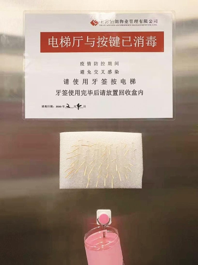切断传播途径是最好的预防办法。电梯作为公共空间,按键的接触人群多,的确可能存在病毒接触传播的风险。近日,继在电梯里放置电梯按键专用纸巾后,又一新的乘电梯“神器”刷屏了——一张告示,一块插上数十根牙签的塑料泡沫,一个空矿泉水瓶底做成的回收盒,出现在浦东新区建华铂中环小区的电梯内,瞬间成了“网红”。 就地取材改用牙签乘电梯装置 “电梯厅与按键已消毒,疫情防控期间,避免交叉感染,请使用牙签按电梯,牙签使用完毕后请放置回收盒内。”记者在建华铂中环小区看到,这张告示下方,数十根牙签插在塑料泡沫上,作为电梯间切断接触传播的道具随时等待被“征用”,完成使命后,它们便来到下方被对半裁剪过后的矿泉水瓶内。 经过几个小时的布置,小区两幢楼内的7部电梯内都装上了这套乘电梯“神器”。物业秩序部主管胡小马拍下了它的全貌,发在业主群里,收到不少业主的点赞。“见过用面巾纸的,用牙签这样的‘奇葩’招数还是第一次见。”一位业主这样评价物业的“杰作”。 其实,这个招数还是小区物业经过多番借鉴和改良后的结果。“我们想过用纸巾,在网上看过很多视频,但是有些人会把纸巾带走,或者用完后扔在地上,不太环保。”胡小马说,几天前,物业领导将一张外地小区采用牙签按电梯的照片发在群里,牙签体积小、易回收,物业工作人员一致认同要引进这一做法。 “我们就地取材,塑料泡沫和回收盒都是废物回收利用,经过了消毒、裁剪。”方案确定后,胡小马和保洁主管碰头负责细节的落实。引进不是完全的“照搬照抄”,物业在此基础上还做了些调整。由于担心小孩会被牙签扎到,特意让工作人员把高度调至成年人的身高,小孩伸手才能够得着的地方。同时,物业还调整了摆放的位置,相较其他小区摆放在电梯按钮旁的方式,他们将牙签放置靠近电梯内测。“一般人坐电梯都是面朝电梯门的,我们放在背后,避免直接对着人。 小区里多了些防疫“守门人” 小区在疫情时期格外安静,记者在其中一部电梯里看到,回收盒里有零散的几根被折断的牙签。“现在疫情比较严重,很多业主担心电梯每天有人使用,不放心。其实,我们每天要消毒几次,只是很多业主看不到,放置牙签乘电梯,更多的是为了让他们安心。”胡小马告诉记者,疫情期间,业主们的防疫意识都很高,也比较敏感,除了一些“看不见”防疫措施外,希望这些“看得见”的小举措能给业主一份安心。 同样“看得见”的,还有小区入口处保安24小时值守的快递、外卖“中转站”。小区采取了封闭式管理后,外卖、快递员不得进入小区,为了节省双方的时间,物业在入口处摆放了三个一米长的篮筐,用来放置外卖、快递,并有保安24小时值守。“有些居家隔离的业主,我们会帮忙送上门,敲门后放下外卖,喊一声,就走。” 疫情之下,小区里多了不少防疫的“守门人”。每天背着重重的消毒桶为小区喷洒消毒液的保洁阿姨,协助居委为居民发放口罩、为进出人员做好登记的物业保安,他们都在为小区居民留住“安全感”。同样地,为了感谢这些“守门人”,居民们在配合的同时还主动参与到小区的防疫攻坚战中。“业主也很关心我们,经常问我们口罩够不够。”胡小马记得,一次在居委跟别人闲聊时,提起买口罩的事,第二天就有业主给他送来口罩。“现在口罩比较紧缺,他也只是买到了10个左右,昨天匀了几个给我,很感谢。” (周到上海)