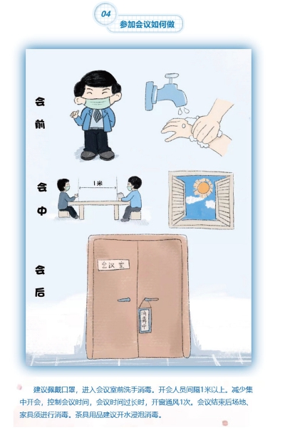 参加会议如何做? 建议佩戴口罩,进入会议室前洗手消毒。开会人员间隔1米以上。减少集中开会,控制会议时间,会议时间过长时,开窗通风1次。会议结束后,场地、家具须进行消毒。茶具用品建议开水浸泡消毒。 |
