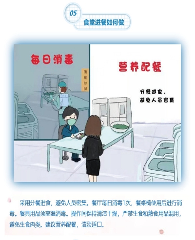 食堂进餐如何做? 采用分餐进食,避免人员密集。餐厅每日消毒一次,餐桌椅使用后进行消毒。餐具用品须高温消毒。操作间保持干燥,严禁生食和熟食用品混用,避免生食肉类。建议营养配餐,清淡适口。 |