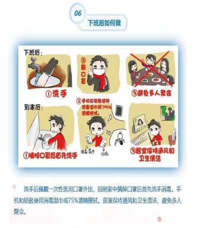 下班后如何做? 洗手后佩戴一次性医用口罩外出,回到家中摘掉口罩后首先洗手消毒。手机和要是使用消毒湿巾或75%以上酒精擦拭。居室保持通风和卫生清洁,避免人多聚会。 |