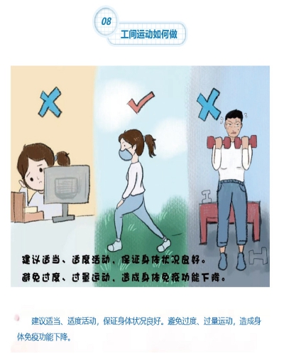 工间运动如何做? 建议适当、适度运动,保证身体状况良好。避免过度、过量运动,造成身体免疫功能下降。 |