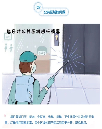 公共区域如何做? 每日须对门厅、楼道、会议室、电梯、楼梯、卫生间等公共区域进行消毒,尽量使用消毒喷雾。每个区域使用的保洁用具要分开,避免混用。 |