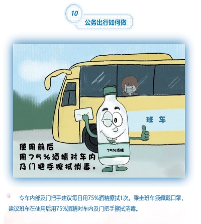 公务出行如何做? 转车内部及门把手建议每日用75%酒精擦拭一次。乘坐班车须佩戴口罩,建议班车在使用后用75%酒精对车内及门把手擦拭消毒。 |