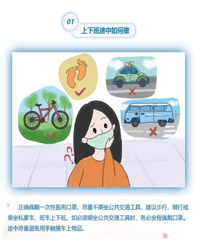 上下班途中如何做? 正确佩戴一次性医用口罩。尽量不乘坐公共交通工具,建议步行、骑行或乘坐私家车、班车上下班。如必须乘坐公共交通工具时,务必全程佩戴口罩。途中尽量避免用手触摸车上物品。 |