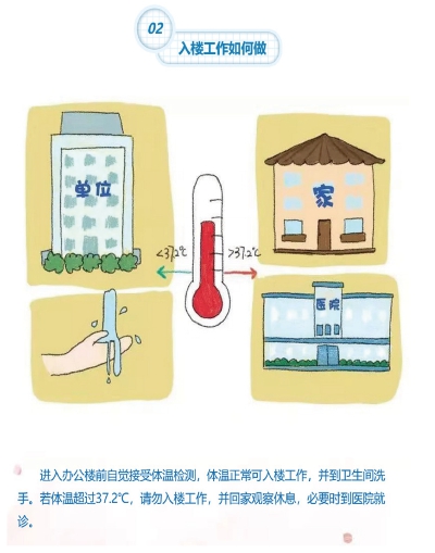 入楼工作如何做? 进入办公楼前自觉接受体温检测,体温正常可入楼工作,并到卫生间吸收。若体温超过37.2℃,请勿入楼工作,并回家观察休息,必要时到医院就诊。 |