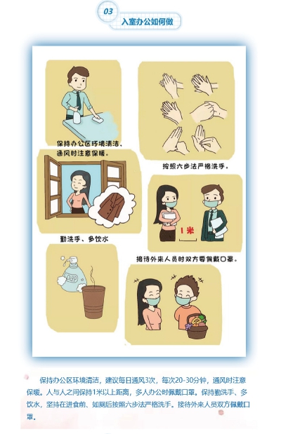 入办公室如何做? 保持办公区域环境清洁,建议每日通风3次,每次20-30分钟,通风时注意保暖。人与人之间保持1米以上距离,多人办公时佩戴口罩。保持勤洗手、多饮水,坚持在进食前、如厕后按周六步法严格洗手。接待外来人员双方佩戴口罩。 |