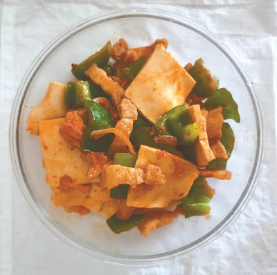 嗨,大家好!我叫榕妈,是住在联洋新社区的一位全职妈妈。对于妈妈们来说,如何抓住家人的胃是个很重要的课题,我虽然不是科班出身,但也算对各美食小有研究。 千页豆腐是一种素食新产品,广泛流行于大陆沿海城市及北方地区,采用新型豆腐制作工艺,以大豆蛋白粉及淀粉为主要材料精制而成,是一种富含蛋白质的料理食材。千页豆腐不仅保持了豆腐原本的细嫩,而且新增了Q弹和爽滑的特性,且经久耐煮,吸汁入味,能给适合煎、炸、卤、煮、炒等多种烹饪工艺。千页豆腐的吃法很多,既可以单独成菜,又可以作主料、辅料,或充作调料;适合多种烹调方法,可蒸可炖可煎可熏可凉拌;可做成多种菜式,多种造型,可为冷盘、热菜、火锅,可成卷、夹、丸、包等;可调制成各种口味,既有豆香的本味,也很容易吸收其他的调味料口味,制成不同的风味。 主料:页豆腐、五花肉、泡菜、青椒 辅料:盐、糖、姜、油 制作过程: 1、五花肉切片、千叶豆腐切薄片、青椒切块备用; 2、热锅冷油爆香姜片,下五花肉翻炒; 3、等五花肉微微发皱,倒入泡菜翻炒出香味,再加入千叶豆腐; 4、翻炒均匀加入适量盐、糖调味,加入少量热水焖一分钟; 5、最后加入青椒,略微翻炒即可。 如果你也是吃货、你也钟情于摆弄美食,就拿起手机扫描下方二维码关注“联洋妈妈俱乐部”的微信公众号,与我们一起分享你的美食经吧。 (关注微信后,回复“姓名+电话”,24小时内会有客服人员与您联系。)