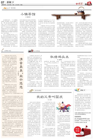 文 廖华玲 在喧嚣的城市,一个人恬静地品着茶,那叫禅茶一味;在宁静的小镇,一群人豪兴地饮着茶,那叫以茶代酒。或许人们在追求精致悠闲生活的同时,也应该用“粗茶淡饭”来调节一下。对我来说,在装修豪华的茶楼里有时已品不出茶香,而透过袅袅茶烟,家乡小镇那沿河而建的吊脚楼茶馆却“海市蜃楼”般若隐若现且“粗茶”飘香…… 家乡,是成都平原上的一个小镇。虽经古老都江堰水系的泽润,但却没有什么历史遗存的“流长”,因而“古镇”旅游开发与它无关。如果称得上小镇一景,怕是只有那破旧的吊脚楼茶馆,木质的青瓦房,一半倚在街边,一半置身河中,其朴素的气质正是许多城里人梦寐以求的东西。 茶馆的临街面,是一条用火砖和碎石铺就的长长巷道,弯弯拐拐,曲径通幽。长巷和小河就像小镇的两条血脉,夹在其间的吊脚楼茶馆于是便生生不息了。茶馆内,土漆的方茶桌早已被烟熏火燎得乌黑发亮,几把竹靠椅,几条长木凳,简陋、土气,但却很实用。小镇人喝茶,就认准一个理:品茶,要花茶,用盖碗。 盖碗茶,以其茶具而得名。这种茶具由三部分构成:茶盖、茶碗、茶船。其寓意为“天盖之,茶盖;地载之,茶船;人育之,茶碗。”它体现了蜀人朴素的人文思想。盖碗茶,碗上加盖,既可保温,蒸发茶叶,加浓茶味,卸下茶盖,又可散热,使其温凉适宜。茶水须趁热而饮,方能沁脾、提神、清心。品茶时左手用茶船托起茶碗,右手用茶盖斜扣或半扣茶碗,嘴就从茶碗与茶盖缝隙间细吮茶水,不仅可以避免茶叶入口,又十分优雅惬意。盖碗泡出精气神,茶之品、茶之性、茶之韵,尽在这盖碗茶之中。 小镇茶馆,市井百态,或听戏溜鸟,或打盹小憩,或浏览手机,或摆龙门阵,时不时还有掏耳朵的、擦皮鞋的、卖小吃的游走其间,大家都悠闲逍遥,自取其乐。见有茶客落座,右手提长嘴铜茶壶,左手卡住茶船和白瓷碗的掺茶师傅便走过来点头致意,道声“给你泡碗三花”。话音刚完,只见他左手一扬,“哗”的一声,一个茶船脱手飞出,刚在茶桌上停稳,又听“咔”的一声,白瓷茶碗便放入了茶船;而右手则高举茶壶,一股水柱临空而降,水泻茶香,瞬间壶水又嘎然而止,仔细一瞧,茶水恰与碗口平齐,却无半点溅出碗外。这种冲泡盖碗茶的绝技,往往使人惊叹不已,成为一种爽目的视觉享受。 清晨,小镇附近的老农挑着一大早刚刚采摘的还带有露水的鲜果佳蔬上街赶集,他们把竹筐往茶馆门前一放,自个踱进茶铺,在临街的茶桌旁坐定。边品茶、边闲谈,若来了买家,老农便打住话头,起身出门说价,成交后回到座位,接着喝。一担水果或蔬菜卖完,茶也喝得差不多了,耳朵里灌满了小镇最新的市井新闻。于是,老农心满意足地起身,一声“收钱”之后,便挑空担而去,那怡然自乐的神态,那轻松飘逸的背影,有点世外高人的风骨。 小镇时不时会遇到一些装备齐全的“驴友”。这些寻古探幽的潮流青年,或许对这趟小镇之行有点失望,然而身体与灵魂都在路上,“返璞归真”就是旅行的全部意义所在。走进茶馆,他们对这里的一切都很新奇,人生至境是逍遥,于是选一处临河的座位,大呼小叫地享乐起来。茶馆老板见状,提起一壶凉茶走到他们桌前,快速地往粗瓷碗中掺入茶水,并端起一碗,吼道:“垒起七星灶,铜壶煮三江,摆开八仙桌,招待十六方,来的都是客,全凭嘴一张。”青年们齐举茶碗,一饮而尽。这哪里是茶,分明是酒,茶原来还可以这样喝哈,喝得豪情万丈。 小镇茶馆,摆的旧桌凳,用的粗盖碗,饮的三花茶,但就是喝得酣畅淋漓,平淡知真味。