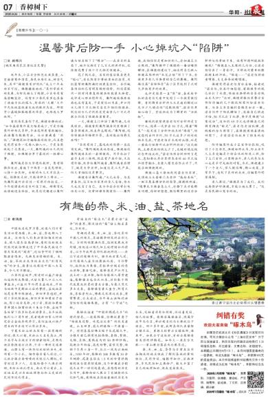 □文 俞鸿虎 中国地名包罗万象,就连人们日常生活必需品柴、米、油、盐、茶也都入了地名。这些与人们生活密切相关的地名,使人读来倍感亲切,看到这些地名恍然间我仿佛走进了中华各民族这个特大家庭的“厨房”,还似乎听到了锅碗瓢盆奏鸣曲。充满生活情趣的柴、米、油、盐、茶地名成为地名文化“别有风味”的分支,数量远远超过中国八大菜系,令人目不暇接。 江苏的盐城市,明清时以盛产海盐而逐渐形成集镇,以后大量人口迁入从事盐业,以盐兴市而得名盐城县,升级为地级市是解放以后的事情。盐城地区还是老革命根据地,新四军东进时,开创了苏皖根据地,新四军军部曾驻于该地,有小延安美称,刘少奇、陈毅和粟裕等开国元勋曾经战斗生活于斯,盐城市各处留下很多红色旅游景点。去年抗战胜利七十周年时,笔者随新四军三师研究会去盐城参观学习。类似盐城以物产得名的市县还可以举出多处。 宁夏米缸山的来历有一段有趣的传说:很久以前,米缸山又名美高山,两个名字与当地方言的谐音相同,是西北地区隆德通往泾源、平凉一带的交通要道,山腰上有一块形似水缸的石头,底部有一个小孔,相传每当有人经过,小孔就会漏出香喷喷的米饭让人解饥,不管经过多少人,总能给每个人漏出两碗,米缸山由此得名。由此可以看出,上述地名是以当地地理特征加上美丽的民间传说而得名。 青海省的“柴达木”是蒙古语“盐泽”的意思,跟汉语的“柴”语义相差甚远,当别论。 有趣的是柴、米、油、盐、茶还是咱中国人的姓氏,是谱牒学研究的出彩之处。古时同姓聚族而居,逐渐发展成为街镇,该地遂以姓氏加上地理特征而得名。以当年我所在部队驻地附近——浙江宁波的柴桥为例,据当地老辈人说,古代柴姓人在当地聚族而居,子孙繁衍,逐渐成为集镇,东临举世闻名的舟山渔场,靠海吃海。柴桥原是芦江河支流上的一座石桥,相传由柴姓人筹资建造,柴桥镇名也由此而来,历经数个朝代发展成浙东的著名古镇,与柴火实无多大关系。柴桥镇背靠天童寺、阿育王庙,东临普陀山,佛教文化源远流长,商贸繁荣、往来通达,当年舟山渔场的渔货纷纷到柴桥集散,古有“小宁波”之称。 柴桥承接着“中国杜鹃花之乡”的时代特色,一进柴桥镇,仿佛就置身于“动枝生乱影,吹花送远香”的优美意境。山上田里,花木种植场一片连着一片,村村落落仿佛点缀于大花园之中。全镇目前已拥有包括西鹃、春鹃、紫鹃、毛鹃、东鹃、夏鹃在内的50余种杜鹃。花期全年衔接,花色纷繁,苗型完整,畅销于华东六省一市、长江一线及以南地区。1999年初,柴桥的300多株有30余年树龄、花篷直径达1.5米的珍贵杜鹃被钓鱼台国宾馆选购,这个新闻在全国花木业中一时引起轰动。在悠悠的历史长河中,柴桥向世人展示了它独特的文化和气韵。柴桥地名连接着她的历史与未来,交融着淳朴和创新,诉说着美丽、动人的故事。柴桥原属镇海县,现属宁波市北仑区,举世闻名的北仑港就位于该区。四十多年前,我所在部队离柴桥古镇不远,星期天经常去古镇逛街,溜鱼市。如果去宁波旅游,不妨去柴桥看看美丽的杜鹃花。如今又一座东方大港——穿山港坐落在北仑港东边。 柴、米、油、盐、茶等与日常生活用品相关的地名使我了解到各地的景观特征、民间传说、谱牒学知识、宗族渊源、乡风民俗和主要物产,极大丰富了自己的地理知识,使我受益匪浅。