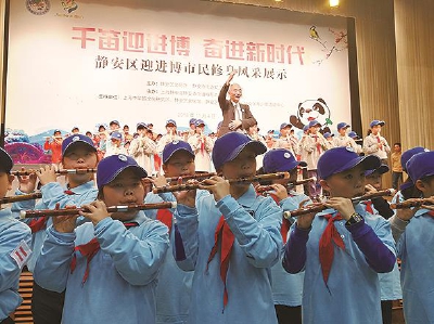 11月4日,在距离首届中国国际进口博览会开幕还剩下不到24小时的时候,静安区迎进博市民修身风采展示活动以一场大型笛子演奏会的方式,吹响了各行各业服务进博会的集结号。 中共静安区委副书记顾云豪,上海市文明办综合处处长丁小硕,中共静安区委宣传部、静安区文明办主任马嘉槟,静安寺街道党工委书记叶智坚,静安寺街道办事处主任洪明铭等领导出席活动。参加本次活动的还有上海市排箫协会、各街镇的笛子爱好者,静安寺街道各社区党员群众、文化团队,以及上海笛文化艺术团,潼港小学和万德小学的老师和同学们。 11月5日,首届中国国际进口博览会在上海开幕。古语有云:“有朋自远方来,不亦乐乎?”宾至如归,一直是中国人的待客之道。当好东道主,文明迎进博,是静安市民义不容辞的责任和使命。笛子是具有中国民族特色的乐器之一,这天,静安市民不仅吹奏出了静安市民迎接进博盛会的喜悦之情,传递静安欢迎八方来宾的友好热情,更加展示了静安文明城区的活力温度,他们用笛声宣布:“进博会,我们准备好了!” 现场,全国精神文明建设先进工作者、全国优秀志愿者、全国道德模范提名奖获得者柏万青,全国劳动模范集体、上海金缔保洁南京西路红旗清道班邢士合,上海静安公安分局交警支队,车宣大队大队长魏维,第三届静安最美志愿服务获奖者、来自华山医院的茅善华以及来自百乐门精品酒店的服务员蒋兴妹和全场近千名笛子爱好者一起吹响“集结号”,邀请各行各业和全体市民以饱满的热情、积极的态度,助力进博、服务进博,当好东道主、喜迎八方客。全国劳模杨怀远也作为笛手来到了现场,号召大家学习新时代的扁担精神。 活动共分为三个篇章:喜迎进博会、共建好家园、奋进新时代。演出曲目中,既有铿锵有力的《时刻准备着》,也有优美动人的《半个月亮爬上来》,既有用最小的笛子口笛表演的《云雀》,也有老艺术家许国屏老师用自己发明的多功能笛表演《紫竹调》,既有中国传统曲目《茉莉花》和《我的祖国》,也有外国名曲《云雀》和《欢乐颂》。最后,全场合奏的《歌唱祖国》把整个活动推向了高潮。 这次市民修身风采展示,既展现了静安市民对进博会的美好祝福,也展现了静安这个美丽城区的文明风尚。通过这一场互动演出,让笛子这个古老的中国传统乐器在新时代绽放出新光彩。(党群办)
