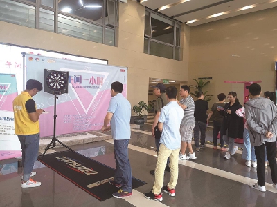 为凝聚融合江湾园区楼宇白领和工作人群,调节白领青年的工作氛围,在团区委的指导下,江湾镇街道团工委协同虹口区北部功能区党群服务中心、江湾镇街道社区党群服务中心新时代文明实践分中心(青年中心)、中国出版蓝桥创意产业园,9月23日,在虹口区北部功能区党群服务中心一楼大厅组织了“午间一小时,减压实验室”青年白领午间增能活动,让青年们在充满趣味性的游戏中,放松身心、释放压力,营造劳逸结合的健康工作理念。 活动主要分为3个游戏环节:飞镖红心挑战赛、眼疾手快挑战赛、电动马达。活动开始后,50余名青年络绎不绝地来到现场,活动现场气氛热烈,大家享受着游戏带来的愉悦。 项目一:飞镖红心挑战赛 青年们在工作人员的指导下投飞镖,每人六镖,有的身姿矫健,投中了红色中心区域。这个项目帮助青年们舒展四肢,在午间,来一场你投我掷的飞镖运动,是办公室白领的最佳选择。 项目二:眼疾手快挑战赛 青年们张开双臂,扎着马步,精力高度集中,只为了抓住随机掉落的杆子,无论是否抓住,青年们都玩得不亦乐乎。这个项目增强了青年们的反应能力,通过眼睛与手速的配合,刺激神经末梢,一顿手舞足蹈、手忙脚乱以后,身体的疲惫得到了缓解。 项目三:电动马达 青年们通过不停的摇摆跳动,将腰间盒子里的乒乓球尽全力抖出。这个项目非常受青年白领的欢迎,除了单人挑战,很多小伙伴和同事们一起,在抖动和跳起来的过程中,开心到“飞起”,享受由运动带来的最简单朴实的快乐。 每一位参与活动的青年白领都有机会获得参与奖礼品,同时在活动中积分最高的3位青年还能领取额外的精美奖品。 “午间一小时,减压实验室”活动有效缓解了青年白领们的压力,同时也让他们感受到运动带来的快乐,帮助他们形成热爱运动、健康科学的生活理念。 (社区党建办)