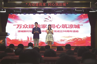 6月24日下午,“万众建我家 同心筑凉城”凉城新村街道庆祝建党98周年活动在社区文化活动中心举行。区委组织部副部长、区社工委书记潘明云,凉城新村街道党工委书记乐跃明,街道党工委副书记、办事处主任陈懿,以及街道全体机关干部、各中心负责人、双管单位负责人、居民区党组织和“两新”组织党组织书记等200余人参加活动。 活动首先由街道党工委副书记、办事处主任陈懿,凉城派出所所长刘伟民为街道社区运维中心联合党支部揭牌。街道社区运维中心联合党支部书记陆晓俊作了表态发言,将以运维中心党支部成员为一个新的起点,立足本职岗位,牢记党员身份,争当先锋表率。随着社区精细化管理的不断推进,街道在社区管理方面持续创新,建立统一完善的调配和管理机制,并成立了凉城新村街道社区运维中心,开启了社区综合执法的创新道路。 此次成立党支部是为了更好地发挥执法队伍中党员地先锋带头作用,以党建引领来加强执法队伍的工作能力,更好地为居民们服务,打造更加安全舒适的凉城社区环境。街道协调整合各类条线队伍,化零为整,组建能被统一指挥调度的社区综合执法队伍体系,让社区执法力量实现几何式增长。其中包括了派出所、房管办、网格中心、劳动协管、安全协管、人口协管、综治协管、小区物业公司、社区管理第三方等多方力量,从而力求在社区综合执法工作中实现“七个一”的目标——诉求统一受理、人员统一调度、案件统一派遣、处置统一反馈,达到一口受理、一口指挥、一口处置。 随后一场生动的活报剧《垃圾分类党员先行》吸引了所有人的目光,让大家感受到楼组党员在社区生活垃圾分类工作中发挥的带头作用。随后,文苑一居民区楼组长陈桂芳向在座的党员发起党员倡议,她号召党员要立足小区,亮身份、作贡献,带动家人,引导身边人,共同打好垃圾分类攻坚战。 为了在垃圾分类工作中发挥党员先锋模范作用,街道社区党建服务中心组建了一支“净美凉城”志愿服务队。团队成员主要由居民区退休党员、“双报到”在职党员、“两新”组织在职党员、区域化党建单位在职党员、“三新”党员等组成。团队将开展志愿宣传服务,对居民小区垃圾分类情况进行走访巡查,开展“啄木鸟”式志愿服务,针对垃圾分类推进过程中存在的问题进行督促整改,发现和记录居民区垃圾分类工作的优秀案例等并进行反馈和宣传。截至2019年4月底,团队已经招募党员志愿者150余名,其中居民区退休党员110名,“两新”组织在职党员20余名,区域化党建单位在职党员20余名。团队已经拍摄了《凉城新村街道垃圾分类宣传片》,将在各个居民区进行播放宣传。团队还将陆续开展更多宣传监督行动,并吸引更多的党员成为团队一员,并在居民区里、单位中发挥党员的先锋带头作用,成为推进垃圾分类工作的重要助力。 活动现场还展示了区域化党建项目“快乐随行·童心绘凉城”的绘画作品,这些作品都来自辖区内学校。经过前期评选,凉城第三小学、上海外国语大学附属外国语小学、凉城第二小学、虹口区实验幼儿园、复兴实验初级中学分别获得“优秀组织”奖;翟叶心(上外附小)、蔡心研(凉城三小)获得“优秀作品”奖。街道党工委书记乐跃明为获奖学生、学校代表颁发了荣誉证书。获奖学校代表、学生分别谈了对环境保护、未来生活的畅想,纷纷表示垃圾分类工作要从自身做起,用自己的一言一行影响身边的人。 最后,区委组织部副部长、区社工委书记潘明云代表区委组织部对凉城社区运维中心联合党支部的成立表示了祝贺,同时,对辛勤工作在党建一线的各位党务工作者表示衷心的感谢。最后,潘部长肯定了街道多年来的党建特色工作并提出三点要求。一是要立足中心点,积极提升党建工作的核心引领作用。要始终围绕党的建设这一核心,抓好各项工作,更好发挥基层党组织的核心作用,凸显党员队伍的凝聚力和向心力。二是找准切入点,坚持党建引领下的基层社会治理创新。坚持党建引领,聚焦重点工作,如垃圾分类、加装电梯、违建拆除等民生领域治理难题,完善自下而上的共治议题形成、协商、评估机制,提升基层自治的能力和活力。三是寻求活力点,最大程度发挥好社区党员、居民群众的主体作用。要以“万众建我家”这样的目标,来激发社区党员、居民群众的主体作用和内在动力,让每个生活在凉城、工作在凉城的人都成为凉城社区建设的主人。 (党建办)