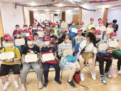 □记者 龙廷凯 7月17日上午虽然天公不作美,但在凉城新村街道的锦苑小区和中虹花园却非常热闹,来自凉城三小、民办迅行中学的中小学生和居住在两个小区的其他青少年们一起参加了“A IA健康运动社区小义工,我为健康代言”活动。本次活动由《新闻晨报》和《社区晨报》携友邦保险有限公司上海分公司发起,目的是在社区内传递健康生活理念,让更多的居民们可以重视自身健康,养成健康的生活习惯。活动现场共有百多位青少年到场参加,大家在签到后领取了专属号码贴和一个装有活动所需使用物品的红色背包,此外每个人也领到了需要发放的《健康倡议书》,他们需要在社区志愿者的带领下把倡议书发给居民们,同时请他们在回执上签字并回收。大家被按照号码进行了分组,由带队的志愿者们带领前往小区里的各个公共场地和居民楼,有的人直接就把倡议书发给了在小区里散步聊天的居民们,请他们仔细阅读倡议书上的健康理念。有的人则敲开居民家的门,当面向他们传达倡议书上的内容,居民们都很配合地在回执上签名,还收到了一份“健康小礼物”——五个口罩。 活动进行近一小时后,有的小组就已经分发完健康倡议书,并带着回执陆续回到了出发的场地。工作人员收集回执后,根据号码贴和姓名为每个青少年送上了奖状,同时为他们拍摄集体照。大家纷纷把奖状放在胸前,摆出各种各样的姿势和表情,与同组的小伙伴们一起留下这难忘的记忆。现场的家长们也都纷纷拿出手机拍下自己的孩子手拿奖状的照片,他们表示,像能带孩子参加这样的社区公益活动是一件非常有意义的事情。孩子们不仅做了公益宣传,还都收获了快乐,并通过与同组的小伙伴以及陌生的居民们交流提升了社交能力,在快乐中获得了成长。每到假期,家长们除了希望能让孩子们通过学习不断充电之外,积极参加社会活动也是重要的刚性需求之一。孩子们需要走出家门,通过各类活动接触社会,从而让假期变得更加充实与快乐。 活动现场留下了很多生动的集体照,这些记录下美好回忆的瞬间一定可以让每个参加活动的人不断地细细回味。
