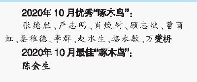 如果您在阅读本月《社区晨报》时发现任何差错,可关注微信公众号“上海社区发布”并于后台直接留言,将您发现的问题发送给我们(注明报纸名称、所在版面、文章名称、差错细节,本期截止日期为12月1日)。本月纠错质量最高的一位读者,将成为最佳“啄木鸟”,并获得100元的现金奖励;本月纠错质量相对较高的另外十位读者,则将成为优秀“啄木鸟”,并获得纪念品一份。
