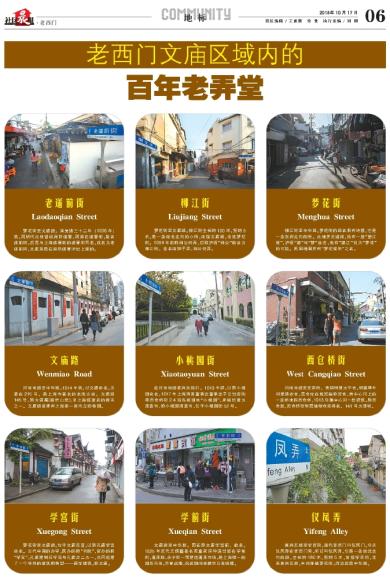 老道前街 Laodaoqian Street 梦花街至文庙路。清光绪三十二年 (1906年)筑,因明代此处曾设海防道署,因路在道署前,故名道前街。后因与上海道署前的道署街同名,改名为老道前街,文庙就是在海防道署旧址上建的。 柳江街 Liujiang Street 梦花街至文庙路。柳江街全长约100米,宽约6米,是一条南北走向的小街,南接文庙路,北连梦花街。1964年前称刘公祠弄,后取沪语“刘公”谐音为柳江街。曾名南狮子弄、刘公祠弄。 梦花街 Menghua Street 柳江街至中华路。梦花街的路名很有诗意,它是一条东西走向的街。此地并无道路,然有一座“望江楼”,沪语“望”与“梦”音近,也有“望江”讹为“梦花”的可能。民国地图亦有“梦花楼街”之名。 文庙路 W enm iao Road 河南南路至中华路。1914年筑,以文庙命名。文庙在215号,是上海市著名的名胜古迹。文庙路145号,原为铎庵(蔽竹山房),旧上海城著名的僧寺之一。文庙路曾建有上海第一座市立动物园。 小桃园街 Xiaotaoyuan Street 在河南南路复兴东路口。1913年辟,以原小桃园命名。1917年上海清真董事会董事金子云出资购得西仓桥街2.4亩私家园林“小桃园”,并捐出建为清真寺,称小桃园清真寺,位于小桃园街52号。 西仓桥街 W est Cangqiao Street 河南南路至庄家街。元朝时建太平仓,明嘉靖年间建济农仓,因仓址在城西俗称西仓,跨中心河上的一座桥也称西仓桥,1913年填中心河一段辟筑。原西仓路、西仓桥街皆因储粮仓而得名。141号为清宅。 学宫街 Xuegong Street 梦花街至文庙路。位于文庙东首,以原孔庙学宫命名。古代中国的办学,民办的称“书院”,官办的称“学宫”。孔庙建制后学宫与孔庙合二为一,共同组建了一个特殊的建筑群类型——庙学建筑,称文庙。 学前街 Xueqian Street 文庙路至中华路。因在原文庙学宫前,故名。1925年近代无锡籍著名实业家匡仲谋出资在学前街、蓬莱路、永宁街一带建造蓬莱市场,是上海唯一的国货市场,声誉远播,抗战期间被侵华日军烧毁。 仪凤弄 Yifeng A lley 复兴东路至学西街。清代老西门叫仪凤门。今天仪凤弄在老西门旁,所以叫仪凤弄,它是一条南北走向的路,全长约 180米,宽约6米,南接学西街,北连复兴东路,中间穿越梦花街,西边就是中华路。