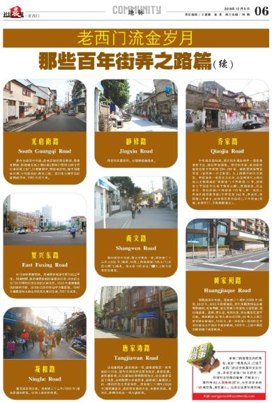 光启南路 South Guangqi Road 复兴东路至中华路。是光启路的南延伸段,原名阜民路,取舜弹五弦之琴以歌《南风》“南风之时兮可以阜吾民之财”,旧名康衢街,有徐光启祠,建于明崇祯年间,今祠屋尚存,陈设已废。因旧名与静安区的富民路同音,1980年改今名。 复兴东路 East Fuxing Road 外马路至西藏南路。是横贯老城厢东西向的主干道。明清时期,原是横贯县城的肇嘉浜河道、浜北的大东门大街等街以及东段的大码头街。1913年填埋肇嘉浜的城内河段,浜北的五条街也归并为肇嘉路。1945年肇嘉路和大码头街统称为复兴东路,1997年拓宽。 凝和路 Ninghe Road 蓬莱路至尚文路。清光绪三十二年(1906年)填也是园浜而筑。以浜上凝和桥得名。 静修路 Jingxiu Road 庄家街至曹家街。以原静修庵得名。 尚文路 Shangwen Road 凝和路至中华路。原为守署浜一段,清光绪三十二年(1906年)填筑,以原上海县城城门尚文门(后称小西门)得名。尚文路133弄龙门 为上海市优秀历史建筑。 唐家湾路 Tangjiawan Road 泛指肇周路、唐家湾路一带。唐家湾原是一条弯曲的小河浜,据传说因浜两边居住菜农,多数姓唐,故称唐家湾。以后唐姓的居民陆续他迁,浜边逐渐造起了住房,这时居民中吴姓居多,唐家湾口肇嘉浜上的一座石桥称为吴家宅桥。清光绪三十四年(1908年)填筑肇嘉浜,唐家湾也填筑为路,名唐家湾路。填浜后,居民仍称这一带为唐家湾。 乔家路 Qiaojia Road 中华路至凝和路。明万历年间武将乔一琦家族世居于此,路以乔宅得名。明代科学家、政治家徐光启出生于乔家路234-244号,故居西侧原有圣母堂(也称第一天主教堂)为上海最早的天主教堂。乔家路是一条历史文化街,这里有清代上海沙船大王郁泰峰的“田耕堂”(今乔家路77号,邹韬奋之子邹家华出生于郁家大院);民国画家、实业家王一亭的梓园(今乔家路113号);乔一琦后人乔光烈故居最乐堂(今乔家路143号,乔光烈,清乾隆二年进士,由知县历贵川巡抚);千年银杏(宋植,永泰街口,宁海禅院遗址)。 黄家阙路 Huangjiaque Road 安澜路至中华路。清光绪三十四年(1908年)辟筑,1912年、1913年续修建成。元代名儒黄铭在此建有野趣轩,宅前有阙,附近居民习称黄宅为黄家阙,因以得路名。黄铭,字日新,号约我斋,宋朱熹高足黄干后裔。黄家阙路36号为黄炎培旧居,99号为上海工商学联合会遗址。1902年,第一所由国人自办的女子学校务本女中创办于黄家阙路。1928年,上海中国医学院创建于黄家阙路。