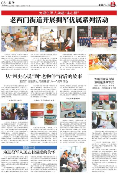 穿上军装,他们是保家卫国的栋梁;脱下军装,他们是民族发展的脊梁。正值“八一”建军节来临之际,老西门街道以“四史”学习教育为主线,坚持崇军特色,优化服务举措,用心用情开展系列“走心”活动,弘扬崇军精神风范和价值导向,增强退役军人的荣誉感、归属感和获得感。 “四史心说”·用心 一朝入伍,军魂入骨。危难时刻挺身而出,祖国和人民利益高于一切,这是军人本色与品格。老西门街道花心思、巧用心,将辖区内1911名退役军人及优抚对象的档案资料进行了整理,深挖革命老兵浴血奋战的故事,逐一上门采访,拍摄了《老西门街道退役军人四史教育活动——四史心说》专题教育片。 追忆历史,用心讲述。看着专题片,回忆从军的峥嵘岁月,极大地激发了退役军人的荣誉感和自豪感,也吹响了新时代催人奋进的“号角”,汇聚起退役军人退役不退色、建功新时代的使命感和责任感。 96岁的老兵张希球收看了专题片后动情落泪,哽咽着说:“再回看这些历史片段,听到这样的故事,我还是十分激动。我的身上有着几处弹片伤痕,如果不是通过这次“四史”学习教育讲述出来,可能很难有人去倾听了解那时候的故事了,我会珍藏这段视频的,也希望更多人可以看到。” “老物件”背后的故事·用情 征程万里,初心如磐。一枚勋章、一个水壶、一支钢笔……翻开的是军绿色的记忆,铸就的是融入血液的军人本色。老西门街道在退役军人服务站建设期间,发出了“从军老物件征集”号令,得到了退役军人及优抚对象的热情响应,他们纷纷将自己精心保存的老物件和历史故事与工作人员进行分享。工作人员仔细聆听,细心整理,通过退役军人服务站综合平台,将每一位退役军人和优抚对象提供的素材,向辖区内居民展示,让参观者了解历史、感受历史,更感受他们的从军情怀。 艾家弄居民区马龙英拿出了珍藏多年的徽章和搪瓷茶杯,讲述起背后的故事:老人1950年入伍,投身于抗美援朝战争,抗美援朝纪念章、搪瓷杯子是那段烽火岁月的见证。 个性化服务·暖心 服务贴心,关爱暖心。为确保退役军人活动有场所、诉求有渠道、帮扶有平台,老西门街道设立了退役军人事务受理专窗,印制了“退役军人政策问答”宣传页,安排专人接待受理;退役军人服务站坚持每月有活动,并突出面对面、个性化的特色服务。每逢重大节日,街道领导到部队和优抚对象家中进行慰问;每逢清明、烈士纪念日组织社会各界开展各类英烈祭扫活动;每逢新兵初到部队、老兵退伍时前去看望,第一时间送去关怀和温暖…… 下一步,街道将继续广泛开展拥军工作宣传,提高拥军工作的主动性,充实和丰富拥军工作内涵,不断开创拥军工作的新局面。