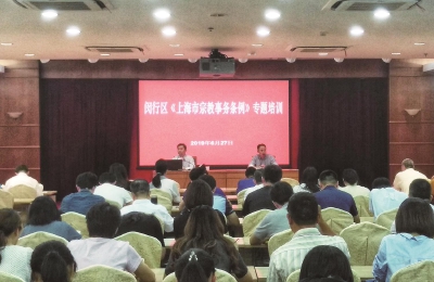 6月27日,闵行区民宗办组织《上海市宗教事务条例》培训,各街镇(莘庄工业区)统战委员、统战干部、基层居(村)委党组织书记、区宗教团体班子成员、区全体宗教教职人员、区民宗办全体工作人员约160人参加。 市民宗局政法处副处长许亢受邀就坚持“导”的态度和方式对待宗教工作、理解把握新修订《上海市宗教事务条例》重点内容和以法治方式推进宗教事务管理这三方面内容进行了深度剖析。他表示,在宗教工作中要做到“导”之有方、“导”之有力、“导”之有效,牢牢掌握宗教工作的主动权,要依法管理宗教事务并处理好依法管理与依政策管理、原则性与灵活性、国法与教规、权利与义务、执法与普法的五大关系。