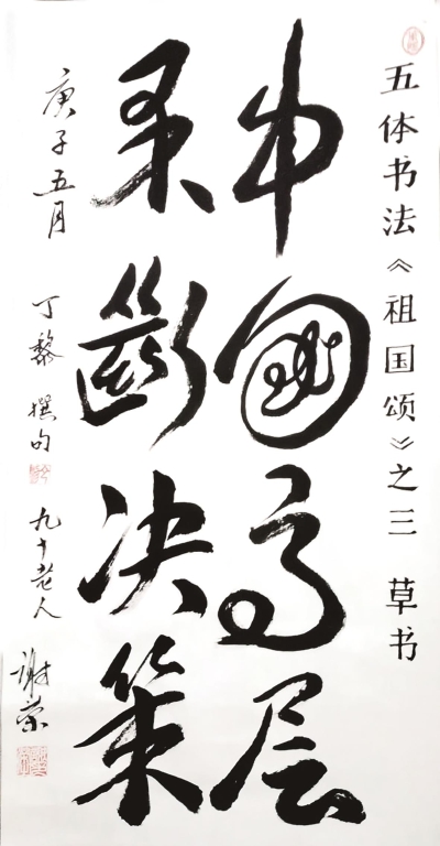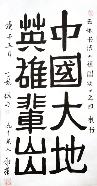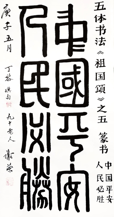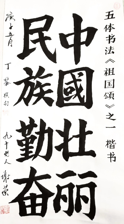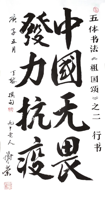 文 谢荣 丁丽娟(本报特约通讯员) 我们夫妇俩,一个91,一个88,都属高龄老人。为啥我俩要写五体书法《祖国颂》?为责任,也为了解闷儿。 一百多天,为阻击新冠肺炎疫情,我俩守护宅笫,闷、憋、烦、怨。现今,终于熬过了最难受的日于,挺过来了。 想起建国七十年来的伟大成就,我俩最先提笔写下楷书《中国壮丽,民族勤奋》,祝福祖国繁荣昌盛。 2020年伊始,群情振奋,各行各业总结经验,期待创新。不料一场大难骤然降临,新冠肺炎疫情侵袭武汉,蔓延湖北。紧急关头,中央立即召开专门会议,习近平总书记亲自指挥,果断作出对武汉“封城”的决定,并采取一系列措施阻击疫情。我俩写了行书《中国无畏,发力抗疫》和草书《中国高层,果断决策》,歌颂党中央为阻击新冠肺炎疫情所做的努力。 之后的两个多月里,在万众一心打赢抗疫“人民战争”的过程中,许多医护人员踏着生死之线,冒着生命危险,不怕自我牺牲,奋力抢救重病患者,努力降低病亡率。在整个武汉和湖北省各所医院内,在雷神山、火神山医院的病房内,处处都是抢救病者的动人情景,医务人员与病员亲密握手,医生说:“请放心,我不会放弃你!”病员说:“有了您,我一万个放心。”我们又写了隶书《中国大地,英雄辈出》书轴,讴歌了钟南山、李兰娟、陈薇、张定宇、张文宏等杰出人士,以及许多在抗疫战线作出不平凡贡献的白衣天使的感人事迹,怀念为抗疫而殉职的勇士:江学庆、刘智明、李文亮、柳帆、夏思思、彭银华……我们永远不能忘记:4600多名同胞不幸罹难,一批医务人员、干部职工、社区工作者因公殉职。 在这英雄辈出的特殊时刻,感恩白衣战士挽救了那么多患者的生命。最令我们老人泪奔的是:湖北重症及危重症病例从最高峰时的超万例到实现清零,成功治愈3600余名80-108岁的老人。最后,我们以篆书写下《中国平安,人民必胜》,我们致敬:2020年的中国抗疫,在中华民族史册和人类发展史上写下的悲壮雄浑篇章。