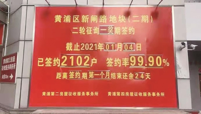 在南京东路街道新闸路地块(二期)旧城区改造房屋征收地块居民的大力支持下、在居民区和征收所全体工作人员努力下,截至2021年1月4日,南京东路街道新闸路地块(二期)酝酿期签约率达到99.90%,实现了又一大体量旧改征收地块高比例通过。 签约首日,已签2097证,签约率达到99.67%。居住在征收地块的党员和居委干部带头签约,虽然当天天气有些寒冷,但居民还是络绎不绝地前来签约,每一张签约桌前,居民们的眼神都充满激动与喜悦。 街道充分发挥党建引领的作用,将党的组织建在征收基地上,与区旧改办、征收事务所密切配合,共同做好前期准备和群众工作,有力推进了地块征收高比例签约。 二轮酝酿期达到高比例,让翘首以盼的居民们欢呼雀跃,直呼等了几十年的新居梦,终于要实现了! (发展办)