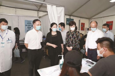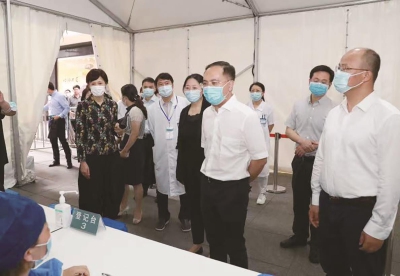 6月15日,区委副书记、区长沈山州,副区长李原、杨东升,在区卫健委、南京东路街道等部门陪同下,走访调研了位于南京东路六合路路口的南京东路步行街新冠疫苗集中接种点。 调研过程中,区领导充分肯定了近期南京东路街道在组织发动疫苗接种工作中所取得的成效,慰问勉励现场的医护工作团队、基层志愿者,并要求相关部门、属地街道要通力协作,持续提升现有接种点的服务能级,为筑牢黄浦免疫屏障贡献力量。 在区领导的关心下,卫健部门、南东街道、南步办以及企业集团的合力推动和互相支持下,南京东路步行街接种点在今年端午节顺利“回归”六合路路口后,迅速受到周边居民群众和来往游客的关注,接种数量也呈现逐日上升的良好态势。 下阶段,街道将持续在精准发动、广泛宣传上下功夫,通过提高接种意愿、优化接种服务,进一步拓展疫苗接种在社区居民、楼宇单位以及社会商户的覆盖面,共同守护美好家园。(党政办)