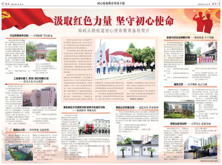 党的十九大把“不忘初心、牢记使命”作为中国共产党的时代主题。习近平总书记讲:“中国共产党人的初心和使命,就是为中国人民谋幸福,为中华民族谋复兴”。 立足新的世情、国情、党情,要时刻准备应对重大挑战、抵御重大风险、克服重大阻力、解决重大矛盾,就必须要有更高的境界、更强的本领、更优的作风、更好的精神状态,不能忘记走过的路,不能忘记走过的过去,不能忘记为什么出发。事实表明,面对诸多矛盾问题叠加、各种风险隐患交汇的挑战,惟不忘初心者进,惟从容自信者胜,惟改革创新者强。 奋进新时代,更应筑牢信仰之基、补足精神之钙、守好“精神家园”。在上海浦东南码头这片热土,今天有八家社区单位成为“南码头路街道初心使命教育基地”。这些地方涌现了一代又一代匠心筑梦的技术革新者,一批又一批日夜坚守的城市守护者,一群又一群在服务生产一线勤业创新的劳动者,一位又一位传承百年教育立德育人的智慧引领者……他们坚守初心、不辱使命,是引领社会前进的时代砥柱,凝聚起推动发展的磅礴力量。这些基地,都将以预约形式向区域内所有党组织和党员开放,成为全社区共享的党建阵地,成为社区党员共同的信仰载体,成为南码头人的精神家园。 初心和使命,承载着我们党初创时的希冀与信念、承载着实现中国梦的责任与担当。守初心就不会迷失方向,担使命就无惧风险挑战。让我们带着初心出发,牢记伟大使命,矢志前行,砥砺奋进,在不忘初心中书写南码头人的使命和担当! 南码头路街道现有8个初心使命教育基地,可进行33项项目活动,各级党组织可根据实际需求进行选择性预约。 预约电话:58390537 社区党建服务中心——引领凝聚笃行致远 南码头路街道社区党建服务中心是南码头社区党员教育、服务、激励和关怀的主阵地。中心以社区党校、书记工作室、区域化党建分会秘书处、党员志愿者之家等为载体,整合社区各方资源、完善仪式教育、情景党课、党建活动、需求对接、区域化党建联动等各项服务功能,在红色教育中引领凝聚党员齐心协力投身社区服务和社区建设,催生社区发展的正能量。 项目一、“四位一体”党建阵地参观 项目二、“誓词如镜见初心”党员仪式教育 项目三、红色情景党课 项目四、党员远程教育学习 项目五、互动体验:劳模书记工作室带头人分享交流 地址:齐恒路19号 上海振华重工(集团)股份有限公司 ——敢为人先匠心筑梦 振华重工是世界上最大的重型装备制造商之一,在全球港机市场占有率连续十多年保持行业第一,成为民族工业的一面旗帜。在企业高速发展的同时,振华重工始终不忘大国工匠的责任与情怀,行走在全球港机制造最前沿,行走在“一带一路”倡议最前沿,行走在民族工业发展的最前沿,用一座座智慧港口,为中国航运业转型升级添砖加瓦;用一次次技术革新,引领行业不断向前;用一个个大国重器,为建设惠及民生的重大工程贡献力量;用一项项节能减排,为子孙后代留下美丽家园。 项目一、核心产品模型展览 项目二、民生项目实景展示(包括智能立体车库、老公房加装电梯、绿色房屋等) 项目三、观看振华企业精神宣传片 项目四、互动体验:远程监控中心现场连线长兴岛基地 地址:东方路3261号 南码头小学——孕育梦想启迪智慧 南码头小学建校于1917年,是一所历史悠久、规模较大的办学示范级学校。文化廊前,书声琅琅;大球场上,英姿飒爽,仿佛把我们带回到点燃梦想、放飞理想少年时光。百年南埠,特色育人;烛光相延,薪火不绝。在这个人生启航、乐学博学的地方,让我们再次照见初心,积蓄起继往开来、砥砺前行的生命能量。 项目一、“南埠百年”校园文化长廊参观 项目二、观看“南埠百年,筑梦未来”校史宣传片 项目三、互动体验:学唱南小校歌——“启航” 地址:东三里桥路16号 浦东新区公安消防支队世博大队临沂中队 ——赴汤蹈火竭诚为民 消防临沂中队承担着南码头及周边地区防范化解重大安全风险、应对处置各类灾害事故的重要职责。这里,是曾经的部队军营,如今的专业消防救援站。这里,有一群南码头平安社区的忠诚卫士。他们日夜坚守,坚定地扛起城市消防安全的使命。他们艰苦训练,时刻准备着危难时刻挺身而出,践行“对党忠诚,纪律严明,赴汤蹈火,竭诚为民”的铿锵誓言。这里还有世界先进的消防器材设备,有与时俱进的消防知识科普,有可供体验的模拟现场。 项目一、观看宣传片《我来》(应急管理部防震减灾宣传片)、《追梦火焰蓝》(形象展示MV) 项目二、队史室参观 项目三、消防器材设备展示 项目四、消防知识培训 项目五、互动体验:消防器材使用(消防水枪、消防梯、破拆工具等) 地址:世博大道176号 南码头历史陈列馆——追忆历史传承精神 南码头历史陈列馆兼具旧居活化、展示教育、文物典藏、学术研究、会展活动等功能为一体。馆内陈列以南码头社区历史地理为地域范围,从传承和开拓的角度来展现南码头这片美丽土地上各个历史发展阶段的经济社会发展及其历史风情,弘扬各阶层、各行业在不同历史时期下展现出的勤勉、拼搏、创新、奉献的南码头精神。 项目一、了解陈列馆的前世故事,建筑特点 项目二、参观馆内基本陈列展览 项目三、观看微党课系列课程——《南码头之路》 地址:胶南路93号 东宝市政实业有