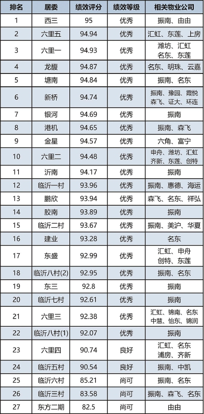 南码头路街道依据《上海市市容环境卫生管理条例》、《2018年上海市市容环境质量监测实效检查评价办法》等相关法规、标准,委托第三方对居住小区、垃圾厢房管理、园林街镇创建、整改情况共四个方面进行检查。27个居住区的绩效评分是92.7分,相比上月基本持平,达到优秀等级。 (管理办)