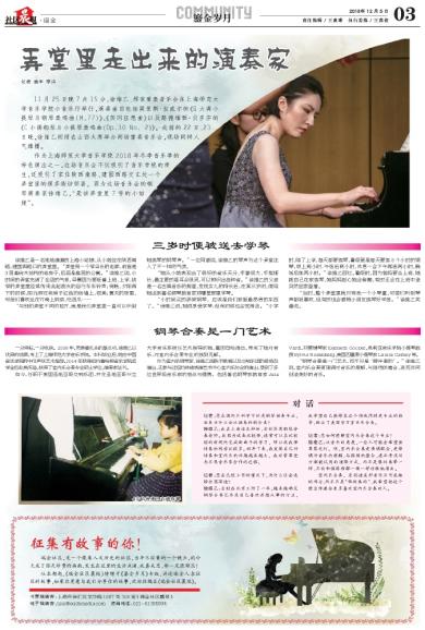 记者 盛丰 李洁 11月25日晚7点15分,徐维乙、邢倞重奏音乐会在上海师范大学音乐学院小音乐厅举行,演奏曲目包括莫里斯·拉威尔的《G大调小提琴与钢琴奏鸣曲(M.77)》、《茨冈狂想曲》以及路德维西·贝多芬的《C小调钢琴与小提琴奏鸣曲(Op.30 No.2)》。此前的22日、23日晚,徐维乙刚刚在山西太原举办两场重奏音乐会,现场同样人气爆棚。 作为上海师范大学音乐学院2018年冬季音乐季的特色演出之一,这场音乐会不仅吸引了音乐学院的师生,还吸引了家住陕西南路、建国西路交汇处一个弄堂里的很多街坊邻居。因为这场音乐会的钢琴演奏家徐维乙,“是该弄堂里7号的小姑娘”。 三岁时便被送去学琴 徐维乙是一名地地道道的上海小姑娘,从小就住在陕西南路、建国西路口的弄堂里。“弄堂有一个窄且长的走廊,前面是3层高砖木结构的老房子,后面是高层的公寓。”徐维乙说,小时候的弄堂充满了生活的气息,早晨因为要赶着上班、上学,狭窄的弄堂里经常传来此起彼伏的自行车车铃声;傍晚,夕阳西下的时候,阳光照在老房子红色的砖墙上,很美;夏天的夜里,邻居们喜欢坐在竹椅上纳凉、吃西瓜…… “与别的弄堂不同的地方,就是我们弄堂里一直可以听到她练琴的钢琴声。”一位阿婆说,徐维乙的琴声为这个弄堂注入了不一样的气质。 “她从小就表现出了极好的音乐天分,手掌很大、手指细长,最主要的是耳朵很灵,可以辨识出各种音。”徐维乙的父亲是一名古典音乐的拥趸,发现女儿的特长后,在其三岁时,便将她送到著名钢琴教育家郑曙星那里学琴。 “小时候买的那架钢琴,应该是我们家里最昂贵的东西了。”徐维乙说,她很享受学琴,但有时候也会觉得苦。“小学时,除了上学,每天都要练琴,暑假更是每天要练8个小时的钢琴,早上两小时,午饭后两小时,休息一会下午再练两小时,晚饭后练两小时。”徐维乙回忆,暑假时,因为爸妈要去上班,她就自己在家练琴,她妈妈担心她会偷懒,有时还会在上班中途突然回家查看。 “当时,整个弄堂里就只有我一个小琴童,邻居们听到琴声都很喜欢,但有时也会感慨小朋友练琴好辛苦。”徐维乙笑着说。 钢琴合奏是一门艺术 一分耕耘,一分收获。2008年,凭借着扎实的基本功,徐维乙以优异的成绩,考上了上海师范大学音乐学院。本科毕业后,她在中国音乐学院附中任声乐艺术指导。2014年获得纽约曼哈顿音乐学院奖学金后赴美深造,获得了室内乐合奏专业硕士学位、演奏家证书。 如今,任职于美国圣地亚哥交响乐团,并在圣地亚哥州立大学音乐系担任艺术指导的她,重回母校演出,带来了她对音乐、对室内乐合奏专业的独到见解。 作为室内乐钢琴家,徐维乙活跃于歌剧以及交响乐团的排练及演出,还参与过纽约林肯表演艺术中心室内乐协会的演出,受到了多位世界级音乐家的指点与提携,包括著名钢琴家教育家A rie Vardi,羽管键琴家Kenneth Cooper,茱莉亚音乐学院小提琴教授Sy lvia Rosenberg,美国四重奏小提琴家Lau rie Carney等。 “钢琴合奏是一门艺术,而不只是‘弹伴奏的’。”徐维乙说,室内乐合奏更强调对音乐的理解、与搭档的磨合,进而共同创造美妙的音乐。 对话 记者:您在国内本科学习的是钢琴独奏专业,后来为什么会从独奏转到合奏? 徐维乙:我在上海读本科时,学校没有钢琴伴奏老师。我因为试奏比较强,通常可以在比较短的时间内完成新曲子的学习,所以找我弹伴奏的同学比较多。四年下来,我发现自己对伴奏和室内乐的兴趣越来越大,我非常享受与不同音乐家合作的过程。 记者:您在已经工作的情况下,为什么还会选择出国深造? 徐维乙:当时在北京工作了一年,越来越确定钢琴合奏艺术是自己喜欢并想从事的行业,我希望自己能够在这个领域得到更专业的指导,就去了美国学习室内乐合奏。 记者:您如何理解室内乐合奏这个专业? 徐维乙:从音乐的角度,一些人可能会希望独享聚光灯。但,室内乐合奏更强调配合,更强调对音乐的理解、与搭档的磨合,进而寻求双方都能认同的演绎方式,而不是像伴奏带一样,不论和谁搭档都一模一样刻板地演出。室内乐合奏,是创造美妙音乐不可或缺的部分,而不只是“弹伴奏的”,我希望把这个理念传递给更多喜欢室内乐合奏的人。