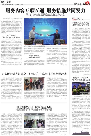 7月14日下午,市人民对外友好协会副会长景莹,市友协办公室党支部书记、处长黄品芳,市友协办公室副处长杨冰一等领导一行到石门二路街道开展交流活动。石门二路街道党工委书记马颖慧,区政府办公室副主任、区外事办主任陈敏,石门二路街道党工委副书记苏玉锋,石门二路街道办事处副主任陈宇韬参加活动。 市友协领导一行首先来到社区党群服务中心,听取街道通过“三建”联动、“五建”同向打造“邻里石二”基层党建格局的情况介绍,了解新时代文明实践活动、社会组织参与社区治理等工作开展情况。 在党群服务中心“岁月拾萃”历史人文展区,领导一行了解石二辖区14处重要革命历史遗址情况,聆听遗址背后的红色故事,领略我党早期革命奋斗精神。在恒丰居委会,市友协领导听取恒丰居民区党总支书记徐隽关于“恒美邻里”居民区党建工作的情况介绍,实地察看首问接待、党务公开、居务公开等工作情况,并与社区工作者亲切交谈。 座谈会上,市友协与石二街道就党建联建、结对帮扶、资源共享等方面进行了深入的交流。市友协景莹副会长指出,石二辖区红色基因丰富,人文气息浓厚,街道在加强党建引领、文化凝聚,服务经济社会发展,增强群众获得感、幸福感等工作中下了很大的功夫,取得了很好的成绩。希望双方能加强结对共建,拓宽合作交流平台,推动资源共享共用,围绕践行“人民城市人民建,人民城市为人民”的理念,共同挖掘宣传好党建引领社会治理的特色亮点,写好基层治理的案例,讲好基层治理的故事,也让国际人士更好地了解党的领导、了解中国与上海的发展。 (街道党政办)