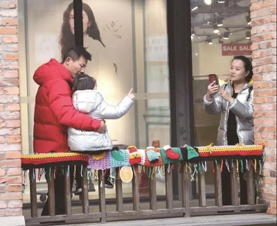 这些“毛绒绒的新衣”出自爱好编织的市民之手,她们用五颜六色的毛线编织了一件件保暖“毛衣”,把园区“包裹”了起来。