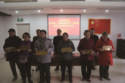 为进一步贯彻落实国务院办公厅和上海市人民政府办公厅关于加快推进为烈属、军属和退役军人等家庭悬挂光荣牌的有关规定,切实做好石泉路街道烈属、军属和退役军人等家庭悬挂光荣牌的工作。2月18日下午,在兰田片区双拥之家举行退役军人家庭悬挂光荣牌启动仪式。街道党工委书记宋胜利、办事处主任李东风等街道班子成员以及来自石泉路街道的30余位退役军人代表参加了会议。 街道党工委书记宋胜利向与会人员表达了衷心感谢,同时指出,悬挂光荣牌是一项非常光荣而重要的工作,要求:要提高政治站位,深刻领会悬挂光荣牌的重大意义。要强化责任担当,不断提升退役军人服务管理保障水平。要拓宽服务范围,切实满足多样化的服务需求。 优抚对象代表顾文妹做了交流发言:“光荣牌的发放是党和人民对我们当兵人的褒奖,也是人民群众对我们的尊重。我们会继续努力,做好力所能及的工作,为建设美丽石泉贡献自己的一份力量。”会上,为退役军人等家庭代表发放了光荣牌。 会后,街道领导宋胜利、李东风、罗务生走访优抚对象乐嘉清,并安装了光荣之家荣誉牌,向其表达了来自政府的关心和慰问。