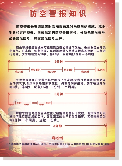 2019年9月21日,是我国第19个全民国防教育日,也是本市第12个防空警报试鸣日。当天开展了以“普及人防知识、增强人防观念、提升人防技能”为主要目标的人民防空集中宣传、防空警报试鸣与演练活动。 防空警报试鸣时间为9月21日11:35-11:58,具体划分: 预先警报:11时35分至11时38分(鸣36秒、停24秒,反复3遍为1个周期,时间3分钟); 空袭警报:11时45分至11时48分(鸣6秒、停6秒,反复15遍为1个周期,时间3分钟); 解除警报:11时55分至11时58分(长鸣3分钟)。 背景介绍 8月26日下午,上海市召开2019年防空警报试鸣工作部署会。市政府副秘书长黄融出席会议并讲话,市民防办主任钟杰主持会议,市民防办副主任汪耀明介绍本市防空警报试鸣方案及准备工作安排。 黄融在讲话中指出: 一要提高政治站位,充分认识开展防空警报试鸣的重要意义。党中央、国务院高度重视人民防空工作,习近平总书记强调人民防空事关人民群众生命安危、事关改革开放和现代化建设成果,是国之大事、国家战略、长期战略。本市每年组织在全市范围内开展防空警报试鸣,既是贯彻国家法律法规要求,又是落实第七次全国人防会议精神、扎实推进上海民防建设发展的重要举措。全市上下要坚持居安思危,切实增强对组织防空警报试鸣工作重要意义的认识。 通过警报试鸣,进一步增强广大市民的国防观念和民防意识;进一步检验全市防空设施设备完好率;进一步提升城市应急预警报知能力。 二要加强协同配合,切实把防空警报试鸣准备工作落到实处。防空警报试鸣工作社会影响面大、涉及部门多,市区各相关部门要树立“一盘棋”思想,按照职责分工,加强协同配合,形成全市合力,确保各项准备工作落到实处。一要切实做好宣传告知工作;二要切实做好警报试鸣技术保障工作;三要切实做好相关演练准备工作。 三要坚守安全底线,确保防空警报试鸣工作圆满完成。各区政府、市相关部门要始终把安全作为一切工作的“底线”“红线”,丝毫不能放松。一要制定切实有效的安全防范措施,充分结合区域和部门实际,研究细化具体的安全风险防范方案。二要防控防空演练中安全风险。防空演练涉及社区居民、企业员工、学校师生等,各单位要严密组织实施,聚焦关键环节,制定切实有效的安全防范措施,确保万无一失。三要落实主体、监管安全责任。防空警报试鸣及防空演练要落实“谁组织、谁负责”的主体责任;相关部门要围绕警报试鸣各时段,针对性地开展安全风险分析,制定安全防范措施,切实担负起安全监管责任。 “民防知识问答”应知应会 一、民防概述 ■什么是民防? 根据《上海市民防条例》第一章第二条,民防是指政府动员和组织群众采取防空袭、抗灾救灾措施,实施救援行动,防范与减轻灾害危害的活动。 ■民防有什么作用? 民防是国防的重要组成部分。战时可以保护人民生命财产安全,减少空袭损失,保存战争潜力;平时是现代城市建设的重要内容,可服务于城市的应急管理和防灾减灾工作。 ■人民防空的根本任务是什么? 根本任务是根据现代战争的特点,动员和组织人民群众采取防护措施,与敌人的空中袭击做斗争,保护人民生命财产安全,避免或减少国民经济损失,保存战争潜力。 ■我国人民防空建设的方针是什么? 我国人民防空实行是“长期准备、重点建设、平战结合”的方针,贯彻与经济建设协调发展,与城市建设相结合的原则。“战时防空、平时服务、应急救援”是人民防空的使命任务。■全民国防教育日设在哪一天? 每年九月的第三个星期六,是全民国防教育日。它是国家设定的,对全民进行大规模国防教育的主题活动日。 二、社区民防建设 ■社区民防建设工作的目的是什么? 目的紧紧围绕新时期人民防空和民众应对突发灾害事故的需要,推进民防工作向社区拓展,向基层延伸,夯实民防工作基础,推动社区民防规范化建设,不断提高城市防空防灾能力,有效保护人民群众生命财产安全。■社区民防建设工作的总体目标是什么?总体目标是社区民防组织落实、工作机制健全、防护预案完善、防护设施齐全、教育培训扎实、民防服务优质。■社区民防建设的主要内容有哪些? 主要内容有健全基层组织,形成有效机制;制订应急预案,适时组织演练;建立避难场所,完善社区服务;开展教育培训,强化自救互救;组建应急队伍,形成处置能力。 ■民防工作小组主要承担哪些工作? 民防工作小组主要承担宣传教育、紧急处置、安全监督和疏散引导等管理工作,做到基层民防工作有人抓、有人管。 社区民防预案■编制社区民防预案的意义是什么? 社区民防预案的编制有利于推进本市基层应急管理及民众防护工作,增强基层民众应急防护能力,提高上海城市安全防护水平。 ■社区民防预案的种类有哪些? 社区民防预案包括社区人民防空人口疏散、人员掩(隐)蔽方案和民众应急防护预案。■社区民防预案一般针对社区面临的哪些风险和威胁? 社区民防预案一般针对上海常见易发、危害较大的台风(暴雨、风暴潮)、地震、火灾、化学事故、建筑物倒塌等五类灾害事故。■社区民防预案有哪些基本内容? 社区民防预案包括九个部分:基本情况、工作原则、组织实施、场所划分、有关保障、组织指挥、防护措施、预案管理和图表附件。 三、社区防空设施 ■什么是防空地下室? 防空地下室是结合地面