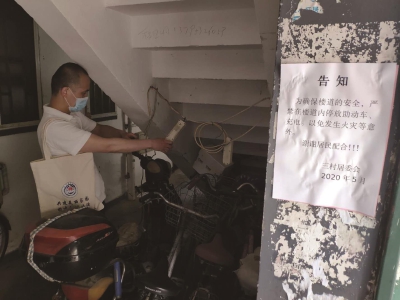 玉屏南路380弄125号存在楼道充电的顽疾,居委干部与民警多次上门劝阻无效。为了楼道居民的生命财产安全,居委干部在社区民警的授权下将楼道内的飞线托板剪断,等候民警进行处置。