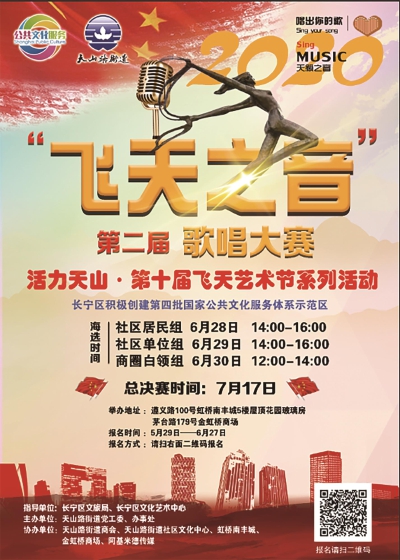天山路街道第二届“飞天之音”歌唱大赛将于5月29日—6月27日开启报名,6月28日开赛。本次歌唱大赛将分别面向社区居民、社区单位职工以及社区企业白领,组织三场先锋对决;通过网络海选与现场复赛,选拔表现优异的12名选手入围总决赛;总决赛将通过“亮音”直播平台进行全程直播,届时将决出一等奖1名、二等奖2名、三等奖3名以及优胜奖若干名。 参赛对象及要求: 生活、学习、工作在天山路街道辖区内的各类人群;自选曲目,形式不限(通俗、民族、美声等),鼓励原创;演唱内容积极向上,弘扬社会正能量。 比赛流程: 1、网络海选阶段。参赛人员通过扫描二维码进行在线报名,并上传音频资料到邮箱24722340@qq.com,音频时间控制在1分钟左右。经专业评委打分后,各组别选取30名选手参加现场复赛。 2、现场复赛阶段。各组复赛选手按照姓氏笔画决定出场顺序;清唱或自备伴奏演唱,曲目自选,时间不超过3分钟;经三位评委综合评判,以分数从高到低确定名次,各组别前4名进入总决赛;复赛结果将在“长宁天山”微信公众号公布。 3、现场总决赛。参赛选手以抽签决定出场顺序;三位专业评委从演唱水平、表演形式、舞台表现等方面综合评判;按照分数由高到低确定名次,决出一等奖1名、二等奖2名、三等奖3名以及优胜奖若干名;总决赛过程将通过“亮音”直播平台进行全程直播;获奖人员名单将在“长宁天山”微信公众号公布。 报名咨询电话: 代老师:021-62414512(8:30-17:00) 钟老师:13916036678 注意事项:报名成功后,请录制一段一分钟左右的未经后期制作的音频(建议清唱,如果有伴奏,伴奏音量不得盖过人声)发送到电子邮箱(24722340@qq.com)。邮件标题格式为报名成功后的报名号+姓名。
