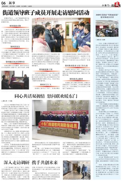 新春佳节前夕,小东门街道领导班子成员分别在社区里开展走访慰问活动,带去了新春的问候。 慰问优抚对象 上海市退役军人事务局副局长李晓辉、上海市思想政治与权益维护处处长龚平、上海市黄浦区退役军人事务局副局长王留青在小东门街道办事处副主任杨兰的陪同下冒雨走访慰问了阳光居委的优抚对象,热切关心对象的身体情况和困难情况,送去了党和政府的关怀和问候,送去了新春的祝福。 慰问居委会 小东门街道党工委书记丁琦宁,办事处主任包童斌、党工委副书记张红莺、吴东亚等一行对辖区内居委会进行了走访慰问,并对春节期间的安全工作、平安志愿者工作以及征收工作等进行了指导和关心。 慰问辖区执法管理单位 街道办事处主任包童斌、副主任孙学万对市场监管所、城管中队、绿化市容所、房管办等执法管理单位分别进行了走访慰问,感谢各单位对街道各项工作的积极参与与全力支持,同时要求在节日期间严格落实带班值守工作,恪尽职守、认真履职,有力有序有效做好节日期间各项安全管理和应急处置工作,确保社区群众过上一个安全祥和、幸福温暖的春节。 慰问离退休干部 街道党政领导班子分14组,带队走访慰问了38位机关离退休老干部、社区离休干部、当年机关退休干部,及时将组织的关怀和温暖送到离退休干部的心坎上,向他们表达了最亲切的新春问候。 慰问环卫工人 街道党工委书记丁琦宁,街道办事处主任包童斌和街道党工委副书记张红莺一行为全年奋战在城市环卫一线的职工们送去了节日关怀和新春慰问,让环卫工人们感受到冬日里来自社区大家庭的一抹温情。 慰问敬老院老人及工作人员 街道党工委书记丁琦宁、办事处主任包童斌、副主任杨兰带领街道服务办工作人员,来到小东门敬老院进行慰问,提前送去了新春的祝福。 慰问优秀志愿者 街道党工委、办事处领导带队,对辖区内居委会进行了走访慰问,并对春节期间区域安全工作、平安志愿者工作以及征收工作等进行了指导和关心。