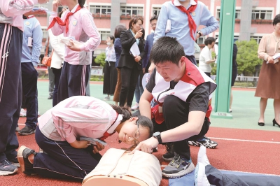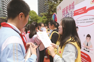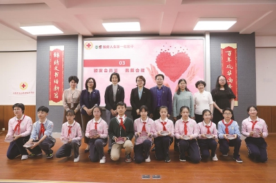 □通讯员 金悦宁 今年的5月8日是第74个世界红十字日。当天中午,在上海市红十字会、黄浦区红十字会、小东门街道红十字会的指导下,上海市尚文中学6、7年级的300余名师生获颁红十字会员证,他们戴上会徽,右手握拳,庄严宣誓,成为了新一批红十字会员。 上海市红十字会副会长李江英,黄浦区红十字会党组书记、常务副会长王春玲,黄浦区红十字会副会长张翠芳,小东门街道党工委副书记、办事处主任、街道红十字会会长包童斌,小东门街道办事处副主任、街道红十字会副会长杨兰,上海市尚文中学校长、尚文中学红十字会会长顾瑛,上海市尚文中学党支部书记谢惠芳共同见证了这一时刻。 入会仪式上,上海市红十字会副会长李江英真诚寄语青少年学生们:青少年一直是红十字工作中的重要力量,希望学生们能牢记誓词,发扬关爱他人、团结互助的精神,早日成长为红十字力量坚强的后备军!随后尚文中学顾瑛校长强调在市、区、街道各级红十字会的领导下,尚文将牢记把传播红十字精神与生命教育、德育教育相融合。 在新老会员发言环节,来自八(6)中队以及七(1)中队的两名学生表示,奉献爱心的方式可以多种多样,并且向所有红十字新会员发出倡议:用实际行动帮助他人,把红十字‘人道、博爱、奉献’的精神发扬光大。 小东门街道党工委副书记、办事处主任、街道红十字会会长包童斌在总结发言中指出,街道红会将大力推进红十字进校园,邀请尚文中学共同建设博爱东门。通过联合开展防灾减灾、助残为老、爱心义卖等具有红十字特色的志愿服务及活动等,加强对学生的安全健康教育以及应急救护技能的掌握,通过开展预防艾滋病、远离烟草、远离毒品等健康教育活动等,抓住安全教育的黄金时间,在青少年中引导社会新风尚、传播人道文化。 在庄严的宣誓后,仪式现场6年级约200名学生来到操场,兴致勃勃地学习红会知识、应急救护技能。