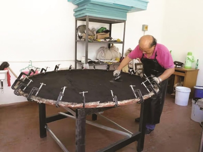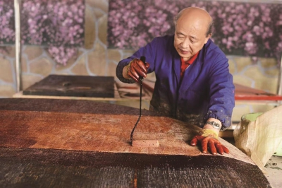 □记者 侯传婷 “小老鼠、HelloKitty猫、小狗……”各式各样的小动物图案被印制在漆器盘子上,金箔图案栩栩如生,再用一个底座架起来,一个自己制作的漆器工艺品就完成了,这就是非物质文化遗产生漆漆艺,居民可以来华漕手工技艺体验基地国富坊体验一把,感受非物质文化遗产生漆漆艺的魅力。 近日,历时一年多时间,闵行非遗大师袁荣富精心特制的直径达1.58米的大漆漆盘完成。从无到有,从制模,再用生漆把苎麻布裱在模具上,最后上灰、上漆、脱胎、打磨、抛光、揩青……,前前后后共计11层,克服了变形、天气等各种难题,大漆漆盘终于完成,袁荣富又完成一个不可能,让我们一起走进国富坊,来看看他是怎么将生漆技艺玩到极致的? 与漆结缘 成为懂漆人 生漆,又称国漆、大漆、土漆、老漆,是我国著名特产,号称“涂料之王”,在我国已有7000多年的使用历史,被广泛应用于家具用具、漆器工艺品和建筑物防腐。生漆漆艺是一种绿色天然的制木技艺,对环境污染小,对人体危害小,是一种耗时耗力的古老技艺。 虽为“涂料之王”,生漆原液却不能直接使用,要经过独特的技术手段进行加工调制,才能成为漆膜坚固、附着力强、耐高温、耐酸碱、光泽度好的优质涂料。调漆,全凭手上功夫,而机缘巧合,袁荣富与生漆漆艺产生了联系。 年轻时,袁荣富在华漕乡插队务农。从农村出来后,1980年进入上海土产公司,开始学习生漆业务,到各地区验收生漆原料。各个产地的生漆不同,同一个产地不同山的不一样,高山阳山的原料品质为上等,用途广泛,阴山低下的原料品质为下,用途局限。“虎斑色、钓鱼钩、酸香味”这是袁荣富验收生漆原料总结的秘诀,这为他后续调制生漆艺术积累了经验。 1981年,袁荣富进入上海国漆厂工作,也开始他的生漆制作生涯,并拜徽邦生漆艺人吴忠仪为师学习技艺。凭借着天赋与努力,袁荣富的生漆制作技艺炉火纯青。 在上海国漆厂工作的这段时间,袁荣富兢兢业业,涉猎广泛。从学手艺开始,当过车间主任、技术科长,做过生漆采购和销售,也参加了建厂和几次设备改造,成为当时这个行业的全能型人才。 除了做生漆产品,袁荣富在古建筑修缮、仿古建筑涂饰施工、漆器工艺品修复、生漆重防腐设备施工等方面也有所建树。“生漆的调制,需经历配漆、炼漆、滤漆等步骤。”袁荣富说道,“不仅每一步都缺一不可,还要考虑好天气环境。”数十年的经验,让袁荣富对生漆的“脾性”了解得一清二楚,有些问题别人解决不了,只有他能解决。 有一年冬天,袁荣富承接的上海大观园牌坊项目进入了紧张的收尾阶段。然而现场工人在上漆时发现,生漆干不了,一直往下滴。到达现场后,袁荣富发现是因为天气干燥所致,他立即重新调制生漆,“新调制的生漆解决了问题,施工进度却十分紧张。”再急也要想办法,袁荣富却请大家吃起了火锅,“这火锅坐在牌坊下吃,温度、湿度都提高了,生漆就干起来快了。” 喜欢挑战自己 敢于挑战不可能 1998年,上海国漆厂改制,袁荣富也辞职出来自己创业,开始了生漆的生意,2002年在华漕镇卫星村建立上海国富漆厂,凭借娴熟高超的生漆技艺,受到合作伙伴的认可,生意做得还算可以。 然而好景不长,2002年袁荣富遇到了一场车祸,被截了肢,好多人都劝他别那么累了,放弃生漆,但是妻子、好友、村干部给予的极大支持才让他缓了过来,开始慢慢适应新的生活。生活的磨难没有打倒袁荣富,反而更加坚定了他将生漆做下去的勇气。没想到,这一做就是将近20年,前不久还为龙华古寺修缮工作调制生漆。 袁荣富在大漆制作过程中不仅熟知生漆调制技艺,还十分喜爱精美绝伦的漆器工艺品,近年来他开始尝试着学习应用技艺。现在社会中,我们都喜欢欣赏精美绝伦、光彩夺目的漆器工艺品,可是漆艺的传承,要包括从山上的野生漆树,到人工种植,再到“百里千刀一斤漆”的采割,最后到我们手中。这期间得经历几十道工序加工,才能做成可以用的生漆,通过上千种的漆艺技法,制成流芳百世的漆器瑰宝。 2017年10月,生漆生产和漆艺手工体验基地建立。2017年9月,袁荣富被评定为该项目区级代表性传承人。 “我想创造一个奇迹,跟自己挑战,我这个人就是喜欢做别人没做的,越难越想做。”袁荣富告诉记者,做之前,很多朋友听到他的想法都直摆手,然而他并没有打退堂鼓。 2018年,袁荣富还为华漕匠人王震华的新作品全榫卯微缩赵州桥制作了底座。同时,也是受到王震华的感染,他决心做一个最大的漆器圆盘。去年6月,袁荣富开始制作大漆漆盘,每天早上就来上一层漆,再水磨,用漆把苎麻布粘在模具上,这是第一层“骨”。此次制作的大漆漆盘共裱 麻布11层,每层都要用瓦灰进行褙麻,直到表面光滑方能进行下一步。 令袁荣富没想到的是,生漆遇到瓦灰,会产生严重的收缩,比例不对、圆盘不圆,漆盘更达不到想要的效果。“正是由于收缩,以往的漆盘都不能做大。当直径放大到1.58米,收缩的情况更是被放大多倍。”袁荣富解释道。 袁荣富制作大盘的过程中,好多人还是不看好,遇到困难后,他不服气,各种想办法去改善。在他看来,真的失败不可能的,关键的是时间,240多天的时间里,每次涂完大漆,再等它慢慢干掉。一点点配方调整,最终制作完成大盘。 “虽然拿到外面看不出来,但我要做到自己觉得完美,才会完美。”袁荣富追求精益求精,大盘完成之后有