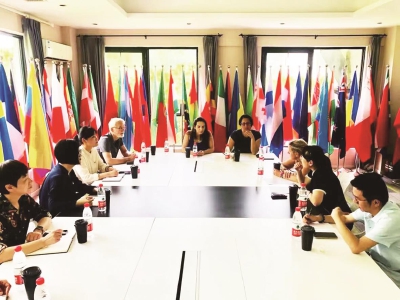 “The Chinese cooking lesson is g reat!(学做中国菜的课程真的不错!)”外籍居民A lexand ra积极主动地表达着自己的感受。她的身旁端坐着另外4名外籍居民代表,身后则是依次排列的各国国旗。会议桌的对面,则是来自美邻苑居民区党总支的几位党总支委员,党总支书记宋叶萍一边听着一边在笔记本上快速地记录着,同时,她的身份还是华漕金丰国际社区发展促进会的理事。