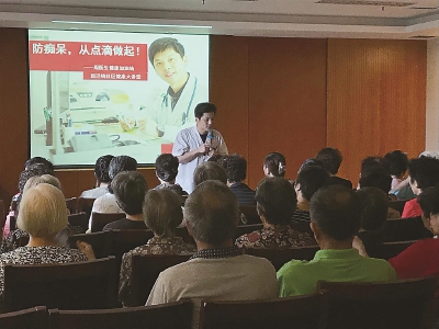 8月 7日,以“防痴呆,从点滴做起”为主题的新泾镇百人健康大讲堂在社区卫生服务中心开展。来自绿一、绿五、虹康及绿八居民区的健康自我管理小组组员参加。讲座中,主讲人周祥俊医师从老年痴呆症的病症、现状以及如何预防等方面进行详细讲解。周医生表示,老年性痴呆是老年人中危害最大的疾病之一;由于老年性痴呆的病因及发病机制未明,治疗尚无特效疗法,以对症治疗为主;饮食均衡,适度运动,避免过度喝酒、抽烟,生活有规律,预防动脉硬化、高血压和肥胖等生活习惯病,防跌倒,对事物常保持高度的兴趣及好奇心,积极用脑,预防脑力衰退等都是预防老年痴呆症的要诀。本次健康大讲堂受到了听众的一致好评,大家纷纷表示受益匪浅。(社区管理办) 9月健康大讲堂主题:“针灸、推拿、拔罐知多少? 时间:9月4 日14:00 地点:新泾镇镇政府(泉口路68号)4号会议室