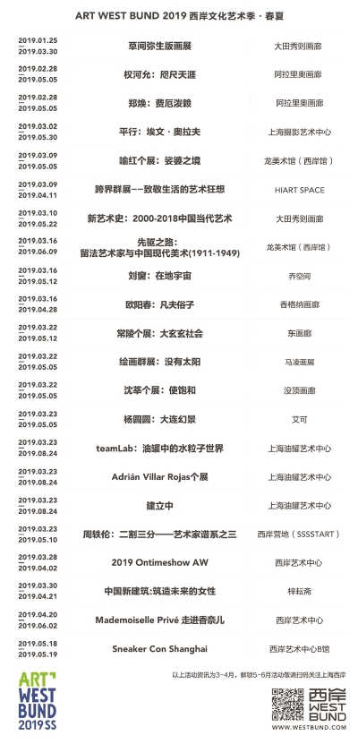 全球一票难求的艺术团队teamLab上海首个站!“亚洲最大订货会”2019 On t imeshow AW!集聚全球目光的“走进香奈儿”展览!引爆全球潮流文化热潮的Sneaker Con球鞋嘉年华!这些都将空降西岸!更令人激动人心的是,20个场馆,38场活动,99天连开西岸将带给你永不停歇的活力。 来西岸,开启一场与世界的先锋对话。 从3月23日起,2019 西岸文化艺术季·春夏将正式拉开序幕,届时将成为这个春夏上海最受瞩目的文化现象,想要探索未知,发现世界,发现自我的无限可能,来西岸就对了。 西岸文化艺术季是上海西岸从2016年起推出的区域性文化品牌,以“西岸计划”为宗旨,以“新水岸、新发现”为理念,每年推出春夏和秋冬两季,打通20多个文化空间的隔阂,囊括西岸艺术与设计博览会、西岸艺场、Ontim eshow等近100场精彩活动。 同时,西岸在今年1月被正式授牌为“徐汇区全球新品首发地”。宝马、雷克萨斯、迪奥、爱马仕等一系列国际一线品牌首秀首发都选择西岸,星耀西岸。在A I+ART“双A”引擎的引领下,西岸文化艺术季将进一步发挥“全球新品首发地”的品牌影响力,以平台化的优势,以多载体、跨平台联动的集聚效应,打造辐射上海的高密度品牌声量和影响力,打响上海文化品牌与购物品牌的金名片。 随着滨水空间的全线贯通以及西岸传媒港等一系列商务区的逐步开放,西岸文化艺术季还将打通文化空间、商务空间和公共空间的隔阂,刷新和丰富区域多元化的生活体验,不断探索文化与商业互动的更多可能。 如今,在西岸文化艺术季的带动下,西岸逐渐打破标签,实现融合无边界和高宽容度。不同年龄、不同性别、不同肤色的人来到西岸都能找到属于你的生活方式!(上海西岸)